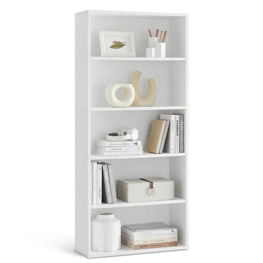 ✨ Transform your home or office with this 5-tier open bookshelf. It combines functionality and modern design, perfect for books, decor, and office supplies. The bookshelf maximizes vertical space, fitting seamlessly into any room. Its compact size (9.4"D x 23.6"W x 52.7"H) makes it ideal for small areas. The white particleboard construction ensures durability and ease of maintenance.
