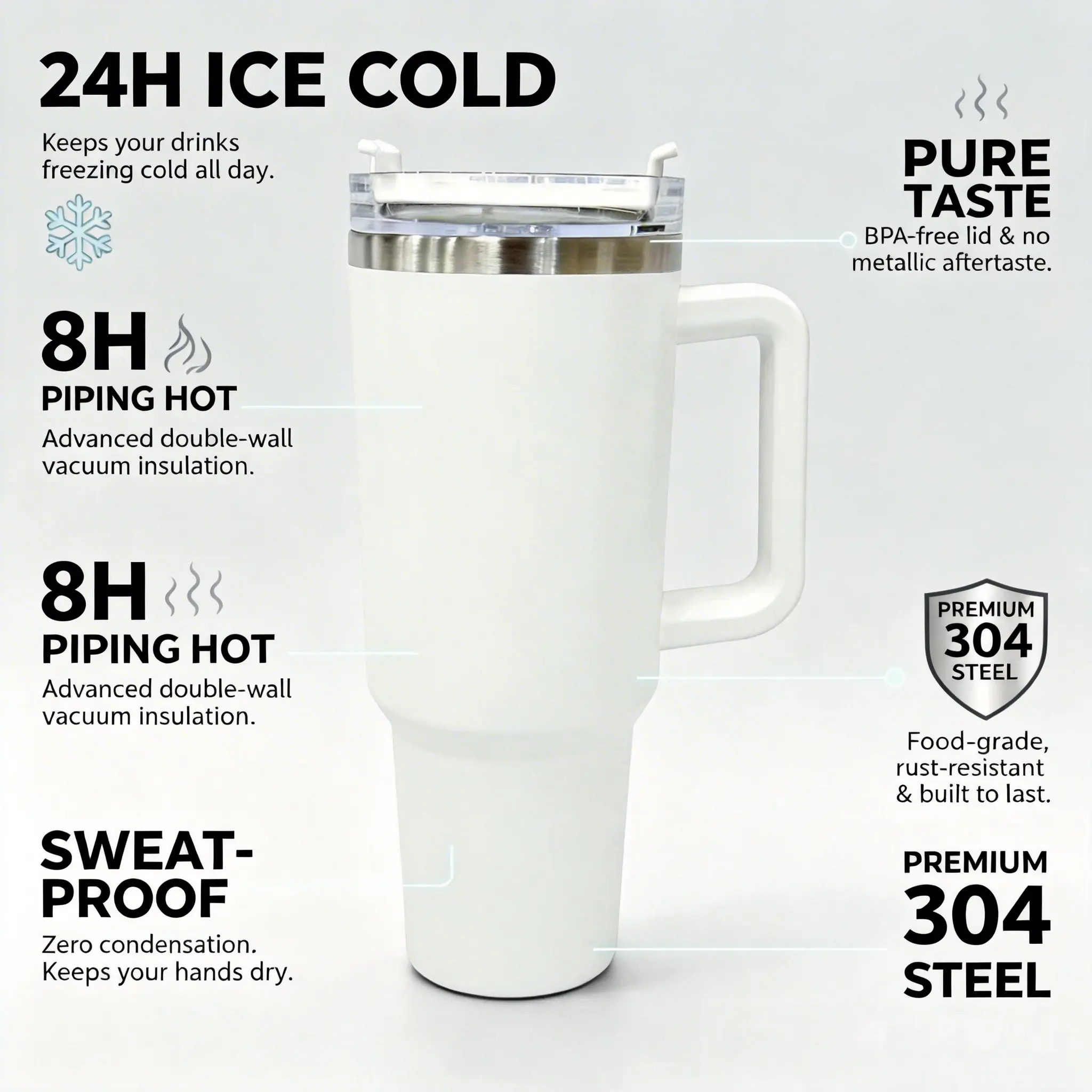 •Built for Real Life:Features a heavy-duty, comfort-grip handle and a completely sweat-proof exterior.Plus, the tapered bottom means it fits seamlessly into your car cup holder.