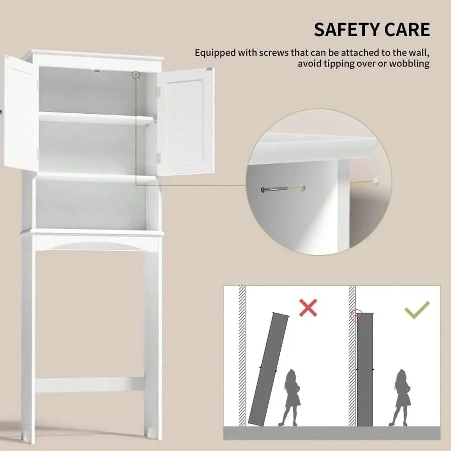 Equipped with magnetic door closures, this over-the-toilet shelf ensures secure closure while protecting the privacy and safety of your stored items.It also comes with wall-fixing screws to keep the cabinet firmly in place, minimizing the risk of tilting or wobbling-providing a safe and reassuring user experience for you and your family.