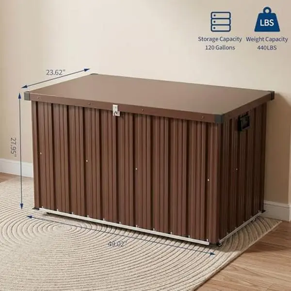 5. 120 Gallon Outdoor Metal Storage Box, Waterproof Steel Deck Box with Lockable Soft-Close Lid, Dual Gas Struts, Wheels, Handles, Large Patio Cushion Tool Pool Storage, Brown,49.02"l x 23.62"w x 27.95"h.