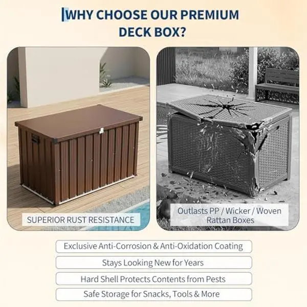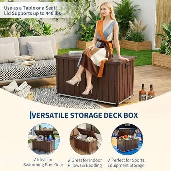 Waterproof & Weather Resistant Protection: Designed as a waterproof deck box and weather resistant storage container, it helps shield contents from rain, humidity, dust, and outdoor exposure, making it ideal for outdoor cushion storage, seasonal décor,    and backyard poolside storage year-round.