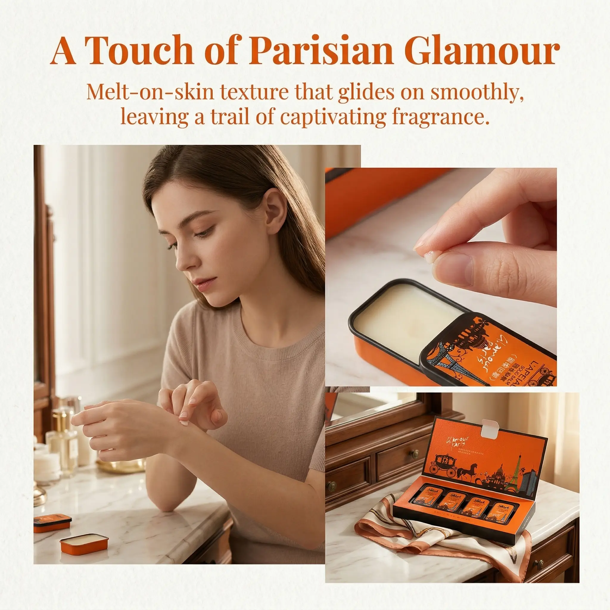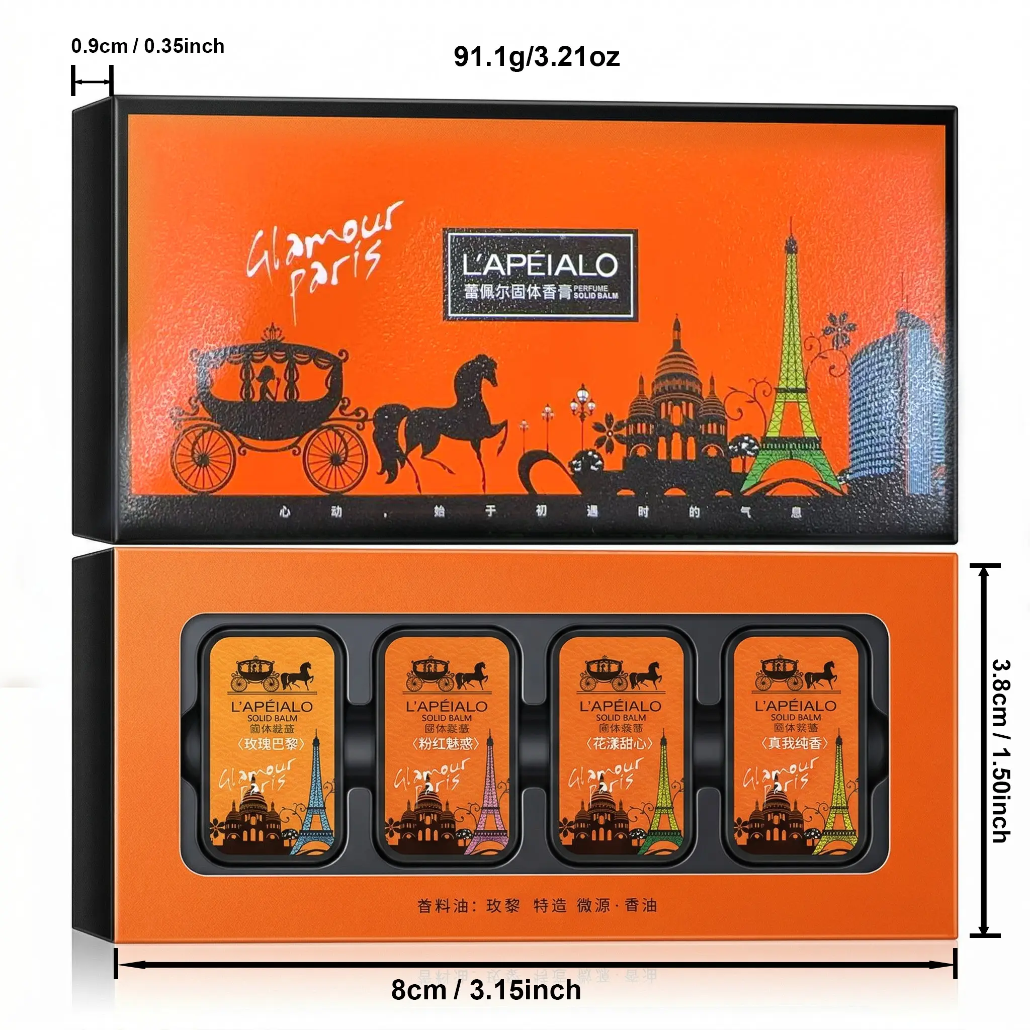 Inspired by the romance of Paris, the L'APEIALO Glamour Paris Solid Perfume Balm Gift Set integrates classic Parisian icons like the Eiffel Tower and French carriage into its retro design, creating a portable fragrance that combines exquisite appearance and premium texture. This set includes 4 distinct fragrance profiles, with an alcohol-free gentle formula suitable for daily use in various scenarios. Whether for daily commute, dating, travel, gifting or collection, it can easily meet your needs, letting you start every first encounter with a heart-touching scent.