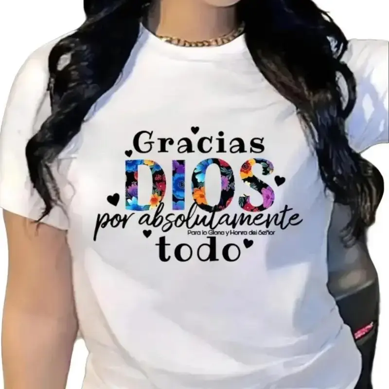 Spanish "Gracias DIOS" printed women's short-sleeve T-shirt, soft and skin-friendly, round neck design, summer vacation casual fashion versatile top