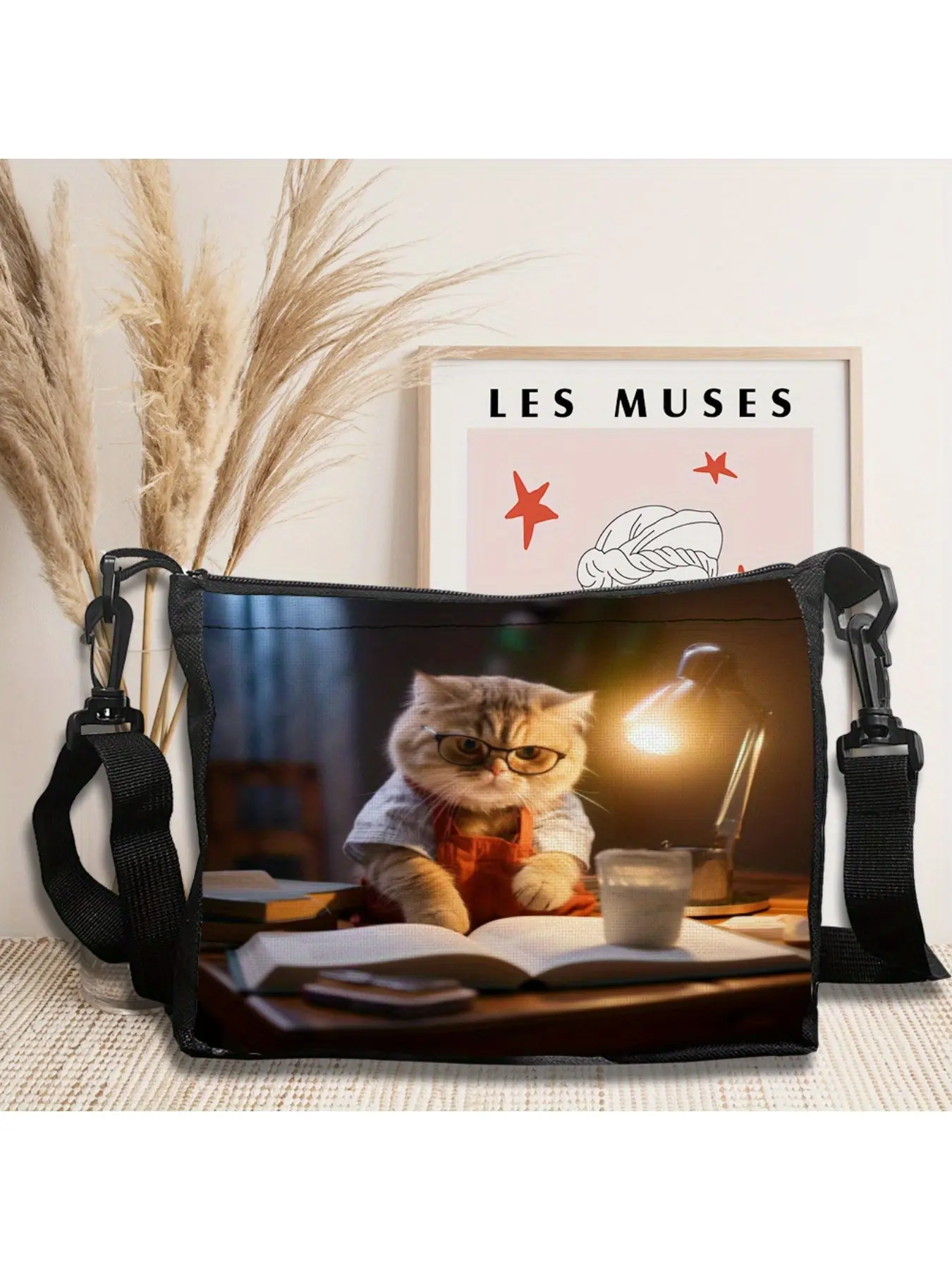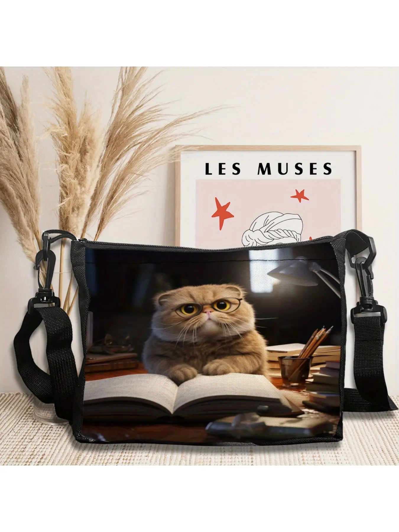 Scottish pleated cat wearing glasses printed shoulder bag, daily messenger bag, cute small bag, perfect for play and leisure activities 6.17