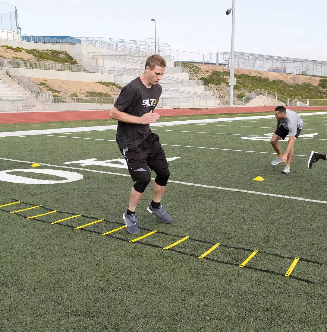 Improve your agility and footwork with the SKLZ Quick Ladder Pro. Made with durable construction and professional grade materials, this training ladder features low-profile edges to minimize the chance of catching cleats. The tangle-free fold allows quick and convenient transportation, while the hinged side rails provide easy set-up and breakdown. Customize your workout by adding more ladders to the extensible ends and sides
