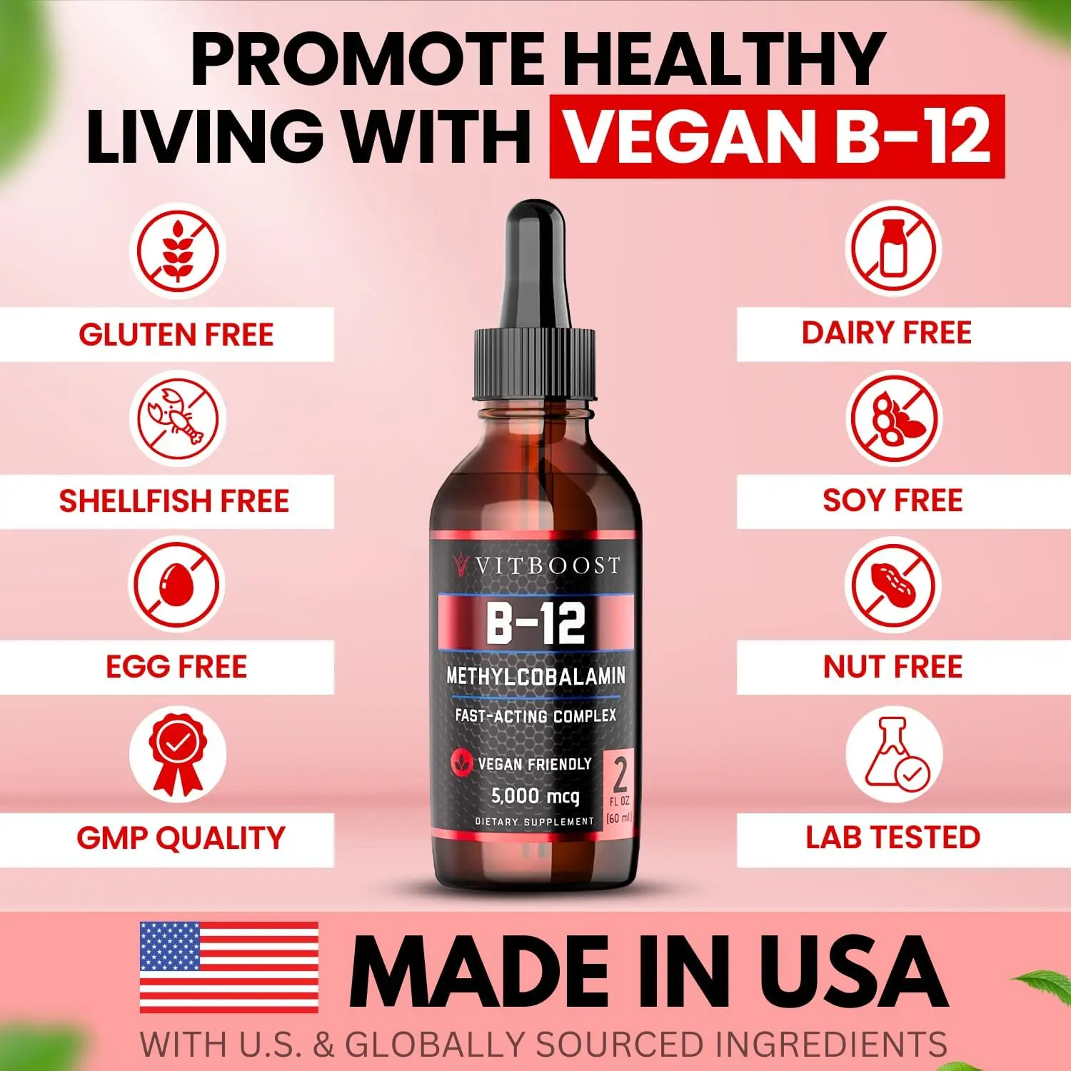 ·BOOST ENERGY LEVEL with VitBoost Vegan Liquid B-12: Vitamin B12 promotes energy production by supporting the adrenal glands, red blood cell formation, and converting carbohydrates to glucose.Vitamin B12 liquid supplement and vegan b12 supplement is the fuel your body uses for energy. If you are constantly tired, this may be in result of not getting enough Vitamin B12. Stay alert and energized throughout the day by boosting your energy levels with B12.