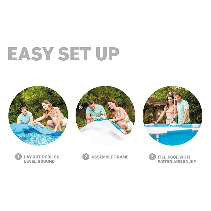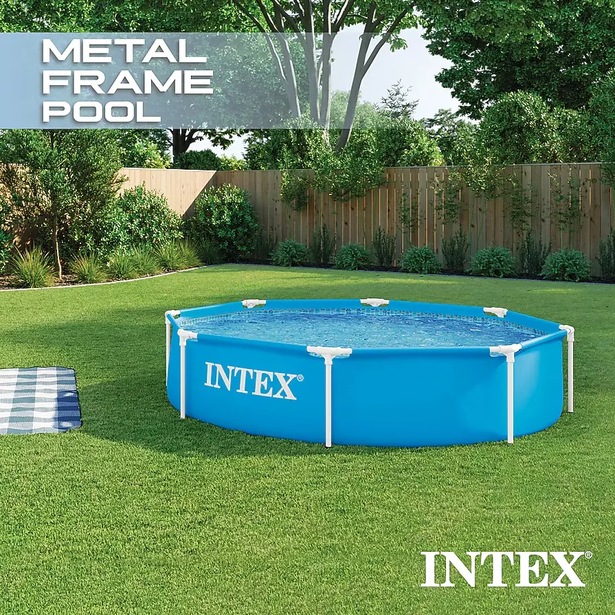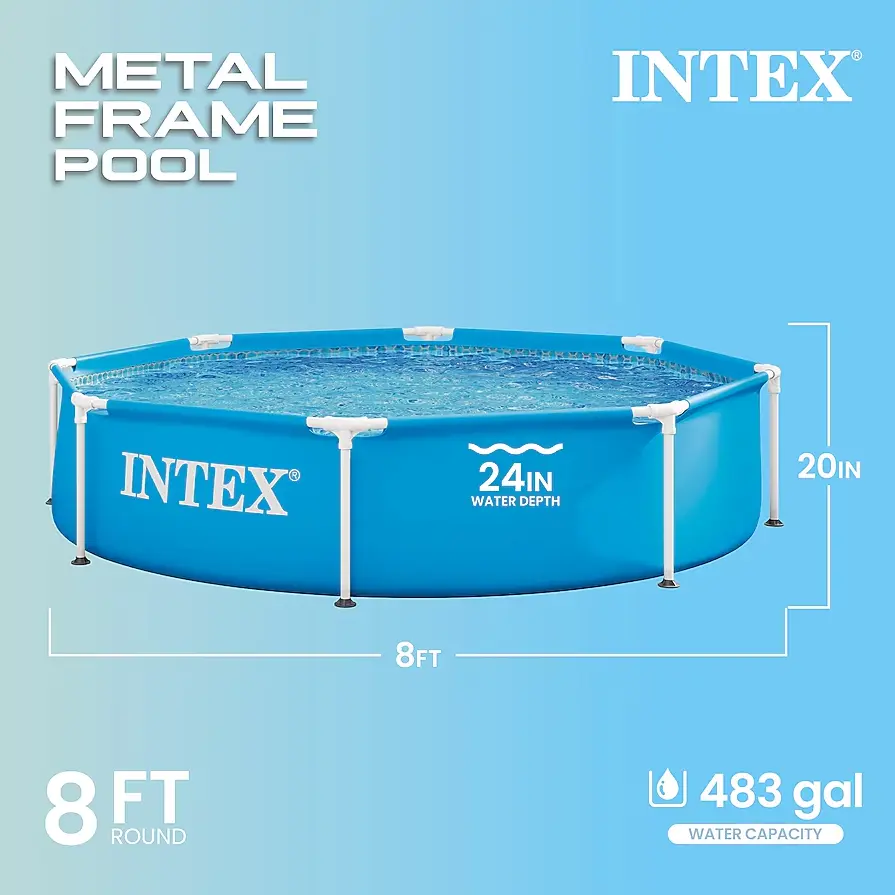 Stay cool and splash away with the Intex Metal Frame Swimming Pool. This steel-framed pool will be a great escape for you and your family, especially on a scorching summer day. This circular pool is easy to set up and sits nicely on any outside surface. These strong steel frames are rust-resistant due to their powder-coated finish and along with the sidewalls, are reinforced by an all-around band. It takes about 30 minutes to set up the pool's framing before it's water ready. The pool provides ample room within, so the whole family can get in on all the fun. Measuring only 8 feet wide and 20 inches tall, the portable pool doesn't take up much exterior room at all so the kids can still have plenty of space to run around. This backyard pool also provides the utmost durability by being constructed with puncture-resistant 3-ply material. Bring water-filled joy to your friends and family with the Intex Metal Frame Swimming Pool. Disclaimer: Please review your HOA rules and restrictions before purchasing this product. Not all housing agencies permit private above-ground pools.