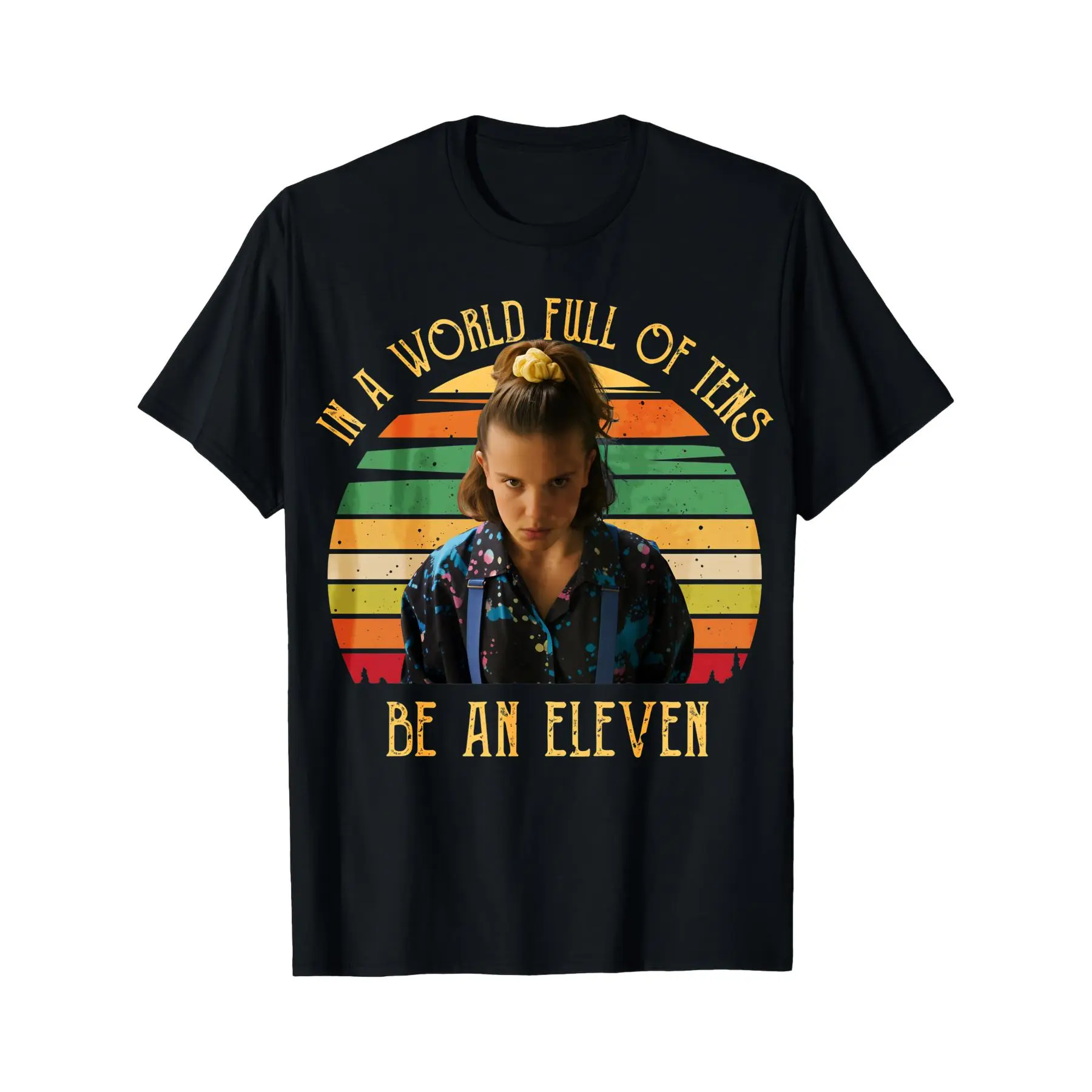 T-Shirt Black Eleven Stranger Things Character With Rainbow Background And Text In A World Full Of Tens Be An Eleven Casual Wear For Fans