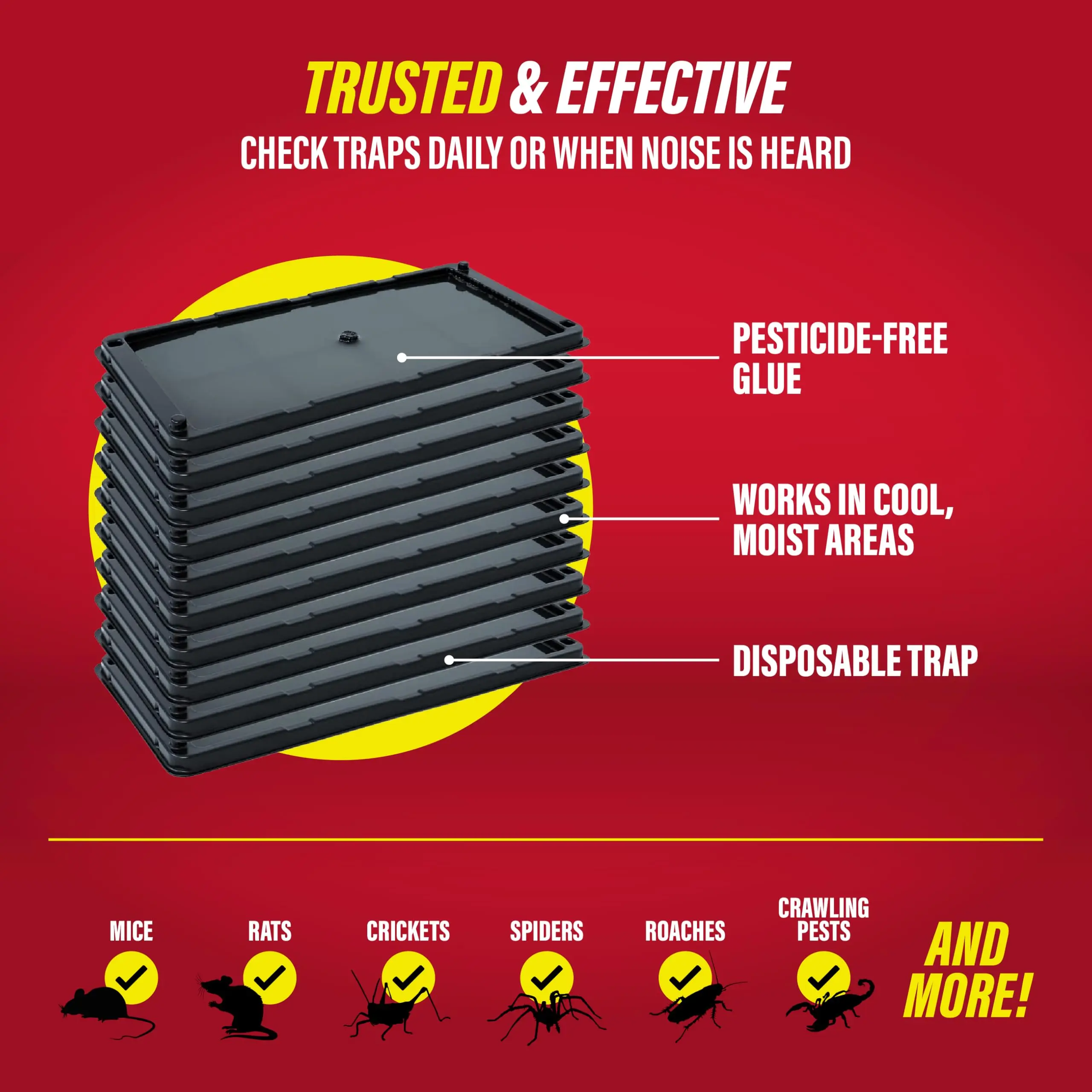TOTAL COVERAGE: The mouse traps can be used in residential, commercial or industrial buildings, or anywhere rodenticides or snap traps are undesirable or prohibited. For best use, place the rat & mouse glue trap along pathways every 4-6 ft avoiding corners and check the sticky mouse trap daily or when noise is heard. For insects place in corners and then every 4-6 ft.