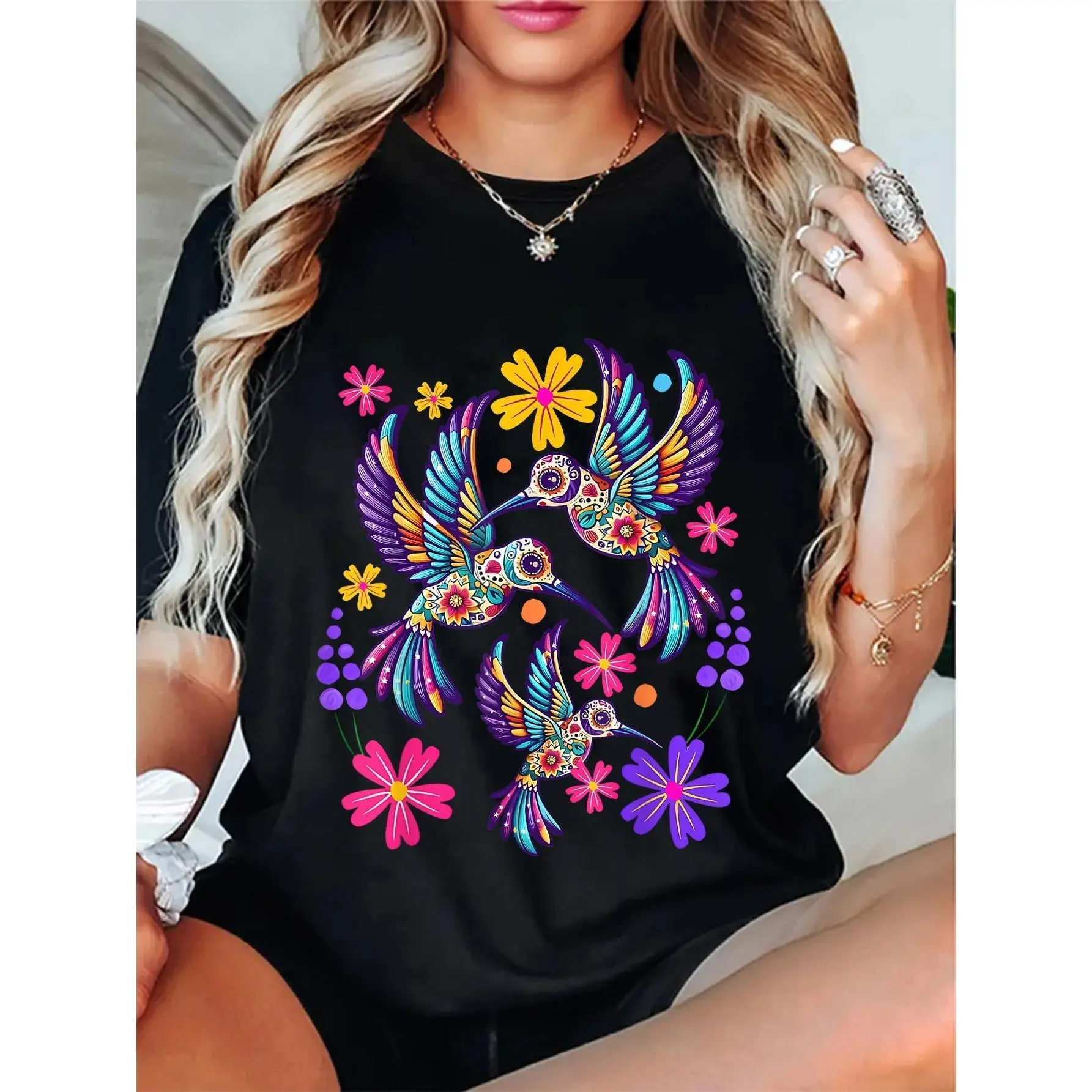 100% Cotton Unisex Hummingbird Colorful Mexican Flowers Bird Floral Nature T-Shirt,Unisex Crewneck T-shirt for Men And Women
