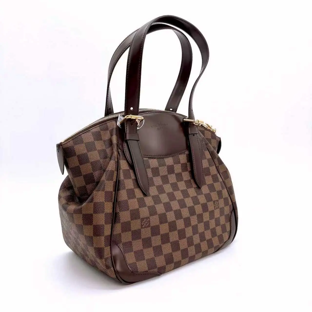 This is an authentic LOUIS VUITTON Damier Ebene Verona MM. This shoulder bag is crafted of signature damier checkered toile canvas. This handbag features brown leather adjustable shoulder straps, trim, and polished gold hardware. The top zipper opens to a durable red fabric interior with patch pockets.