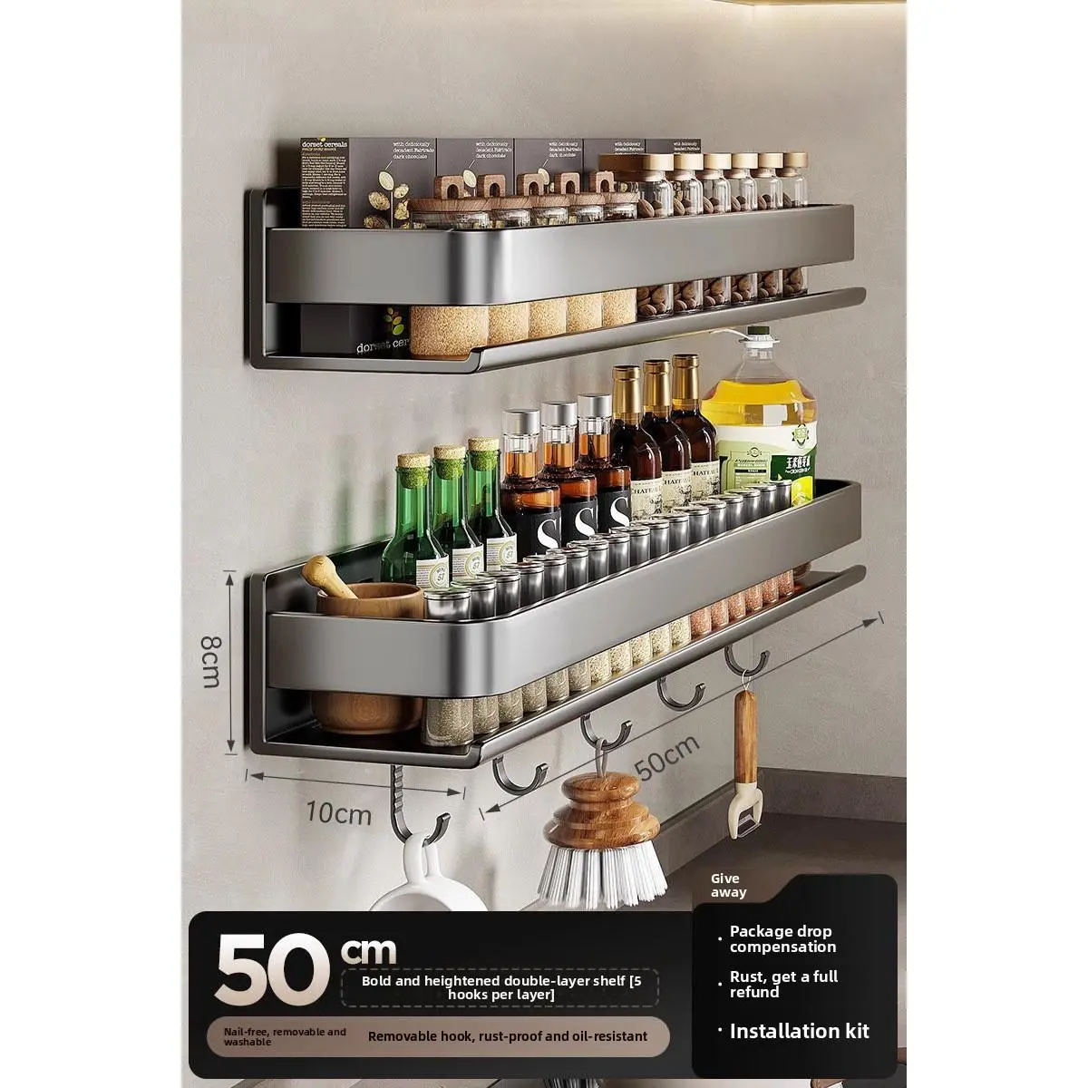 Kitchen storage rack, seasoning shelf, punch-free wall-mounted multifunctional hanging rack for condiments on the wall