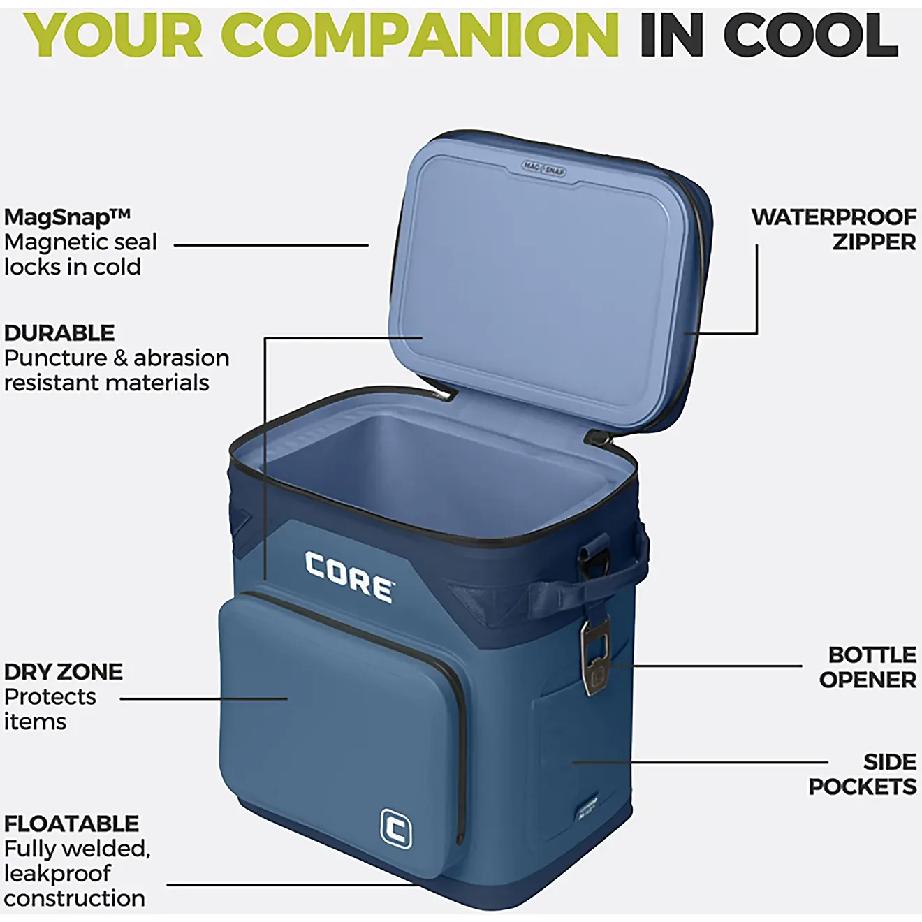 ·MAGSNAP magnetic lid opens effortlessly and seals itself to keep your items cold