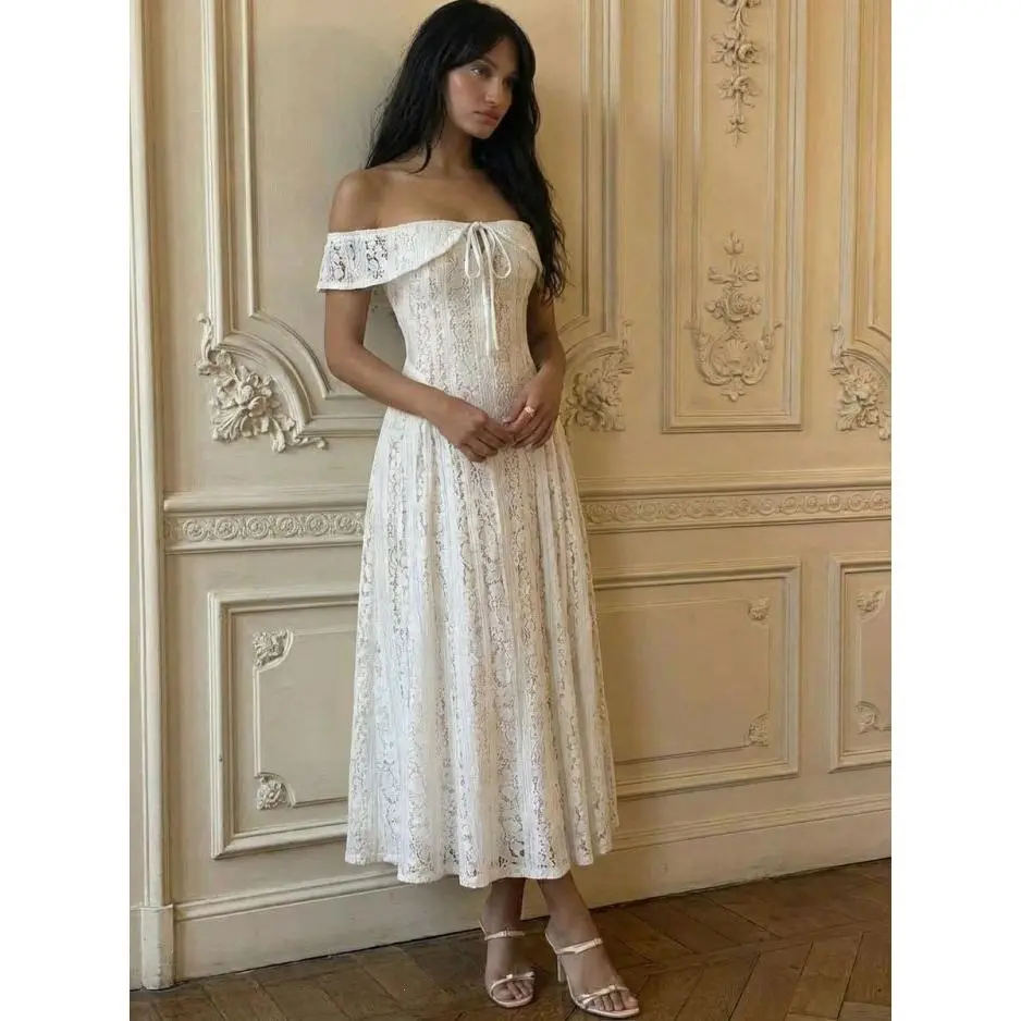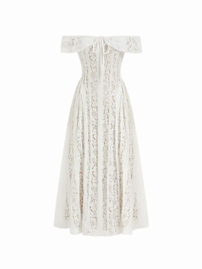Lace Off-Shoulder Knotted Flared Maxi Dress