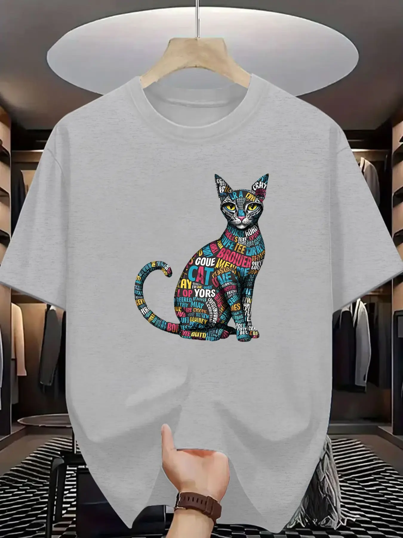 Artistic Word Puzzle Cat Short Sleeve T-Shirt, Summer Slim Fit Casual Top, Boys' Fashionable Tee, Unique Design, Cool Look