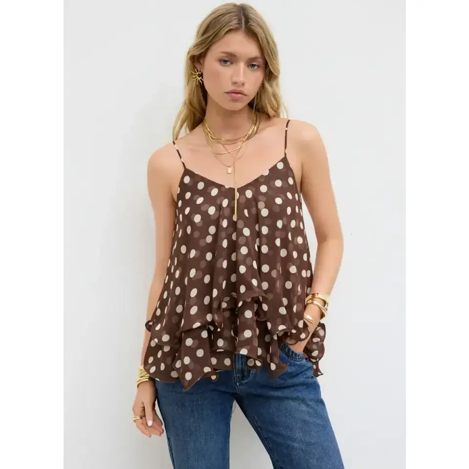 Wanda Printed Mesh Ruffled Tank Top