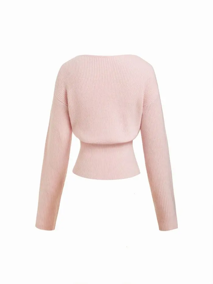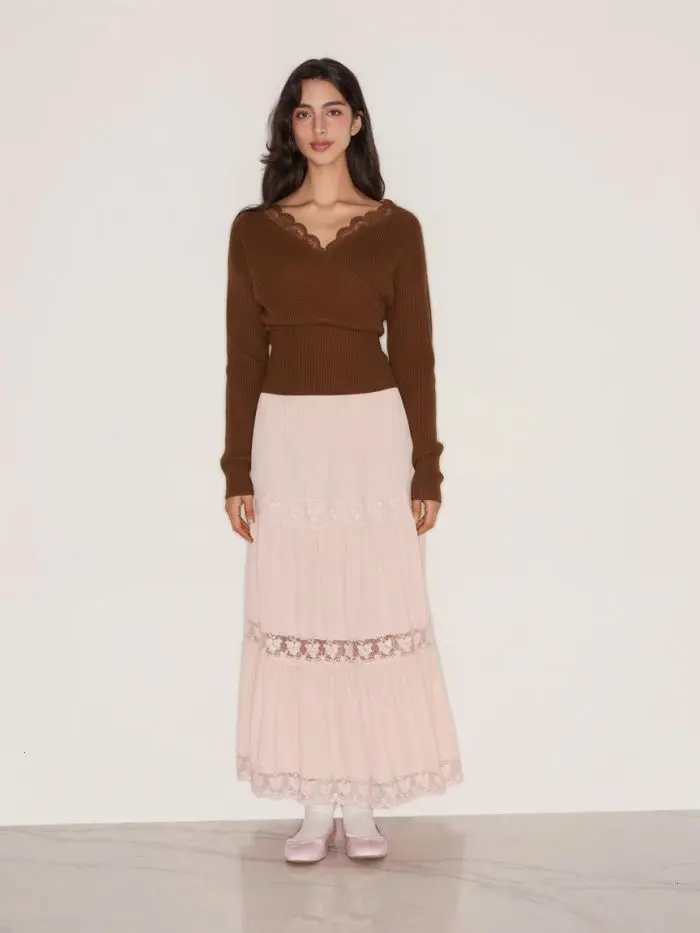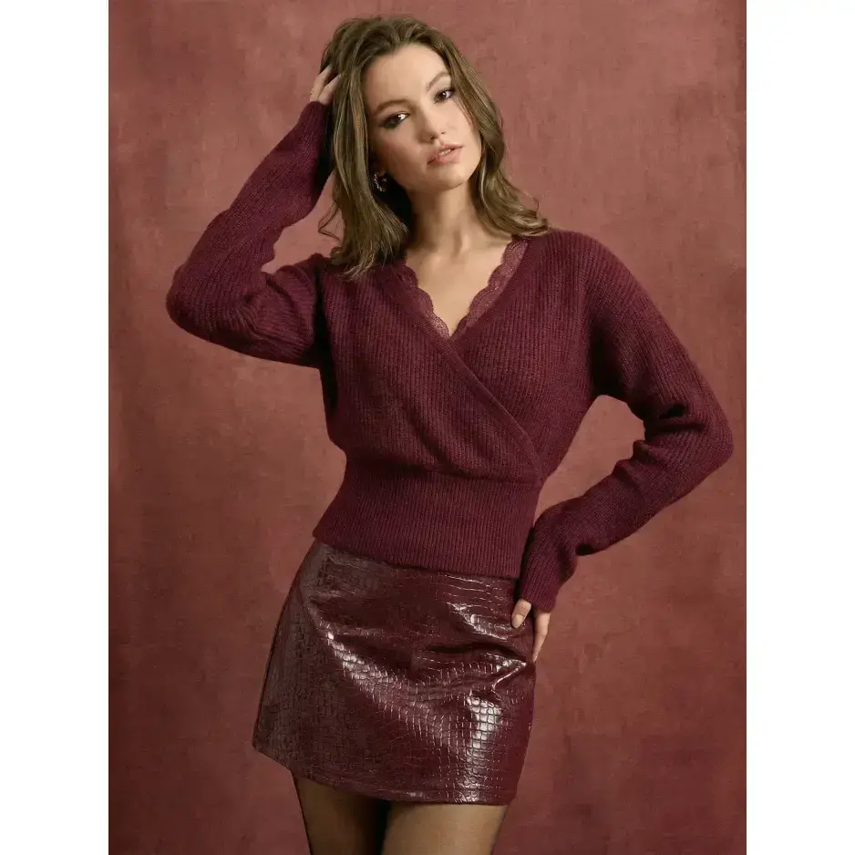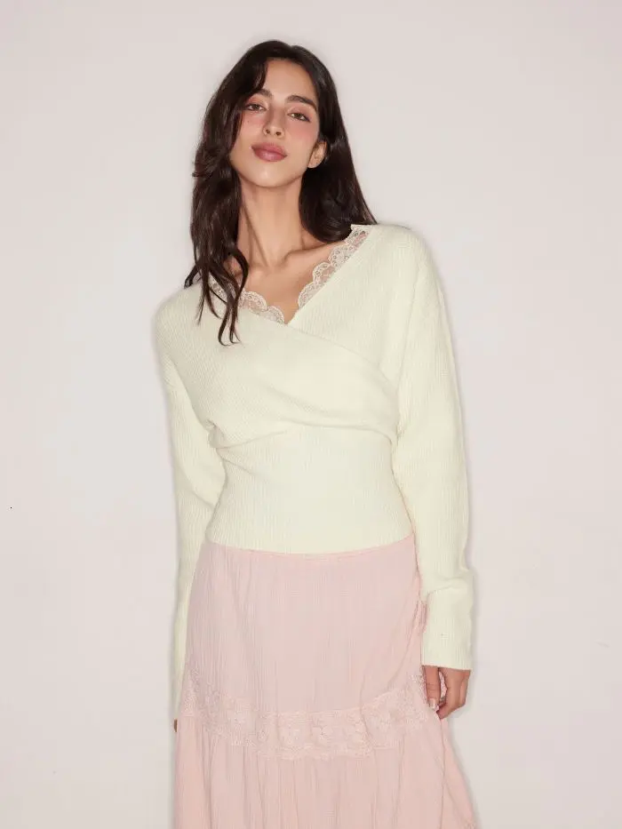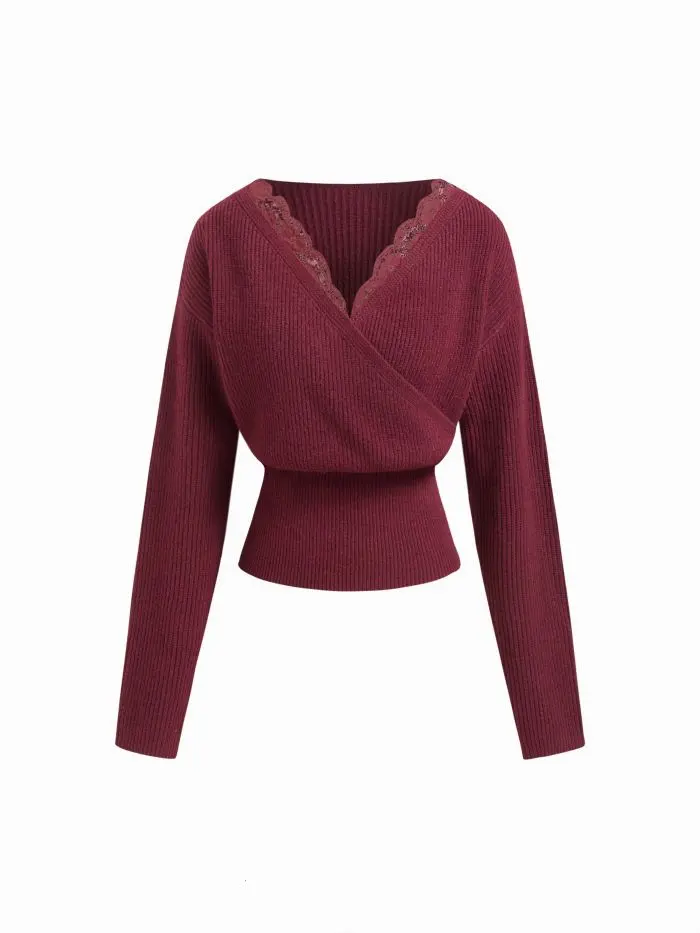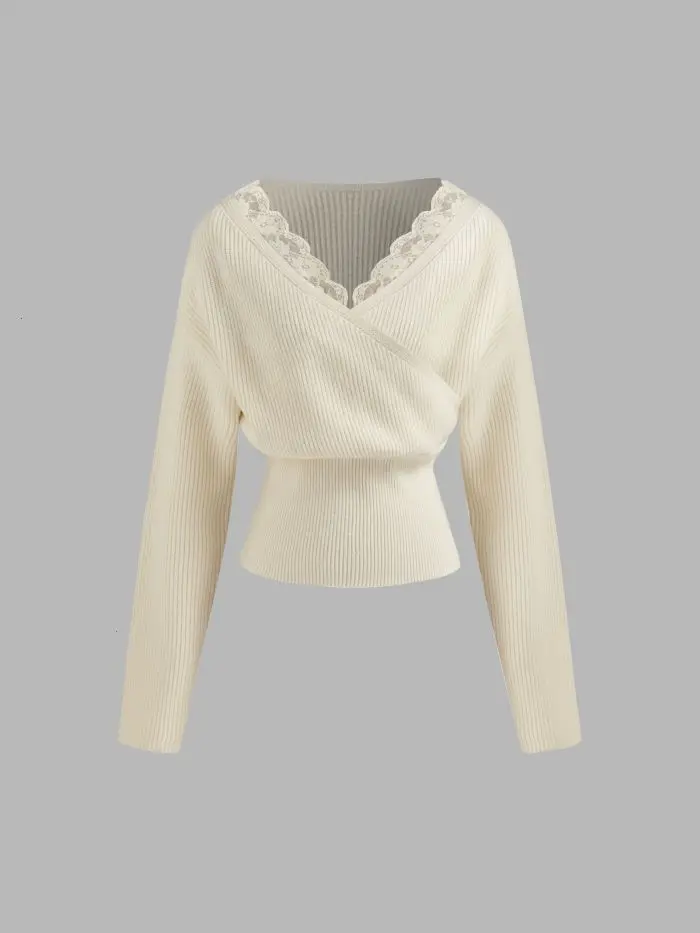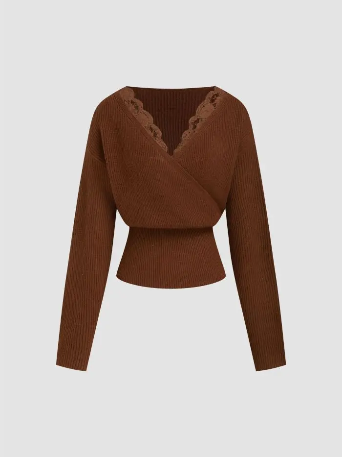 Knit V-neck Solid Lace Trim Wrap Long Sleeve Top