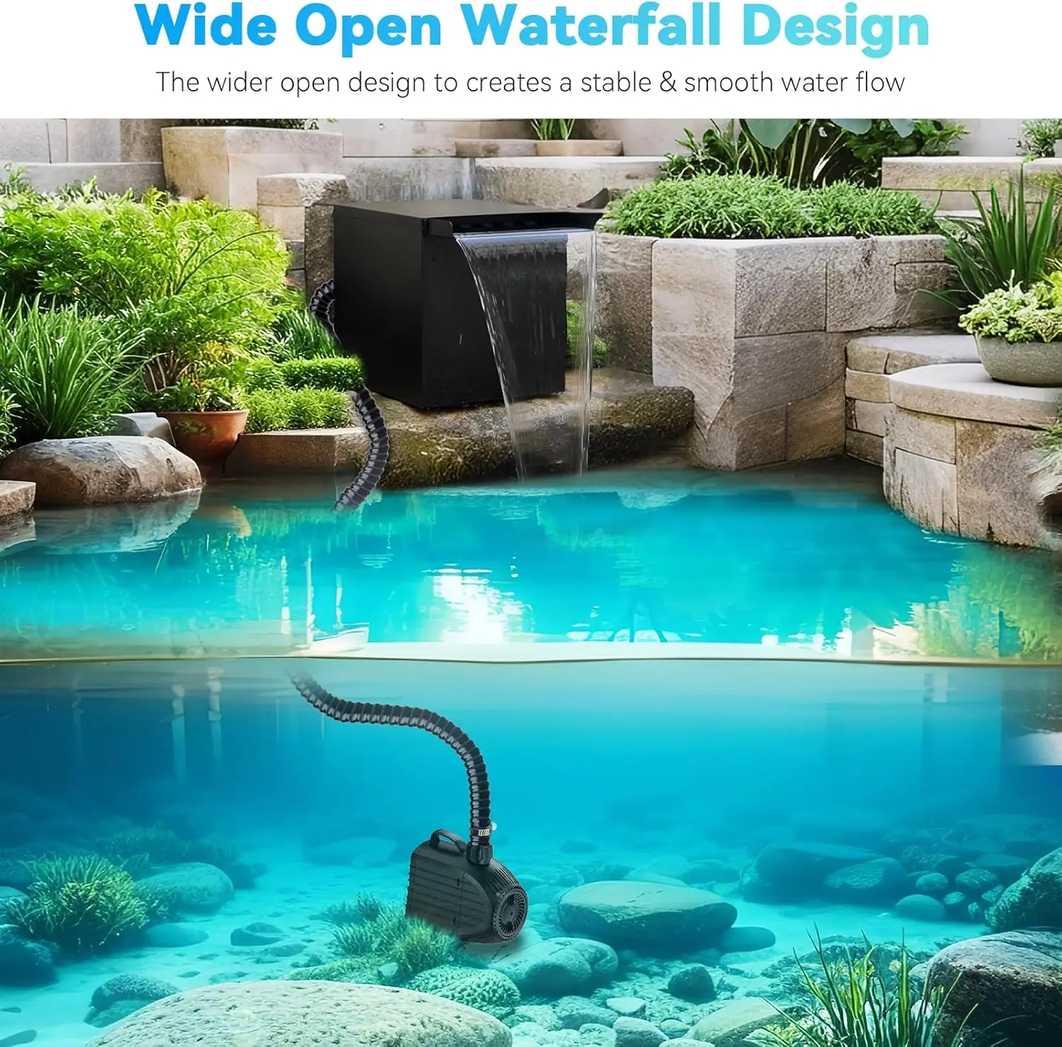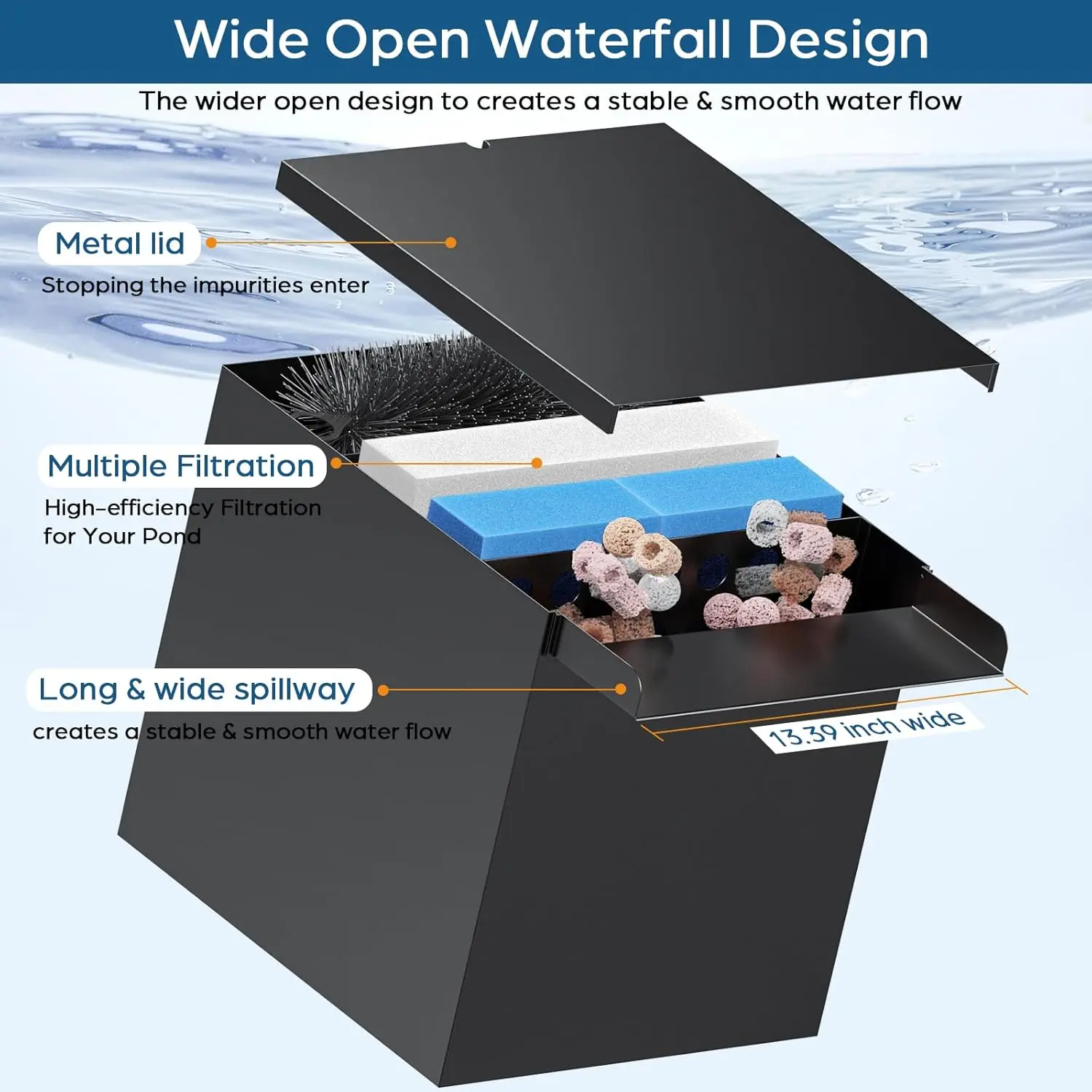 ·Oversize: 14.2"L×12.7"W×13.5"H stainless steel waterfall box & a robust 1200GPH pump, up to 4,500 Gallons for Garden Outdoor Pond