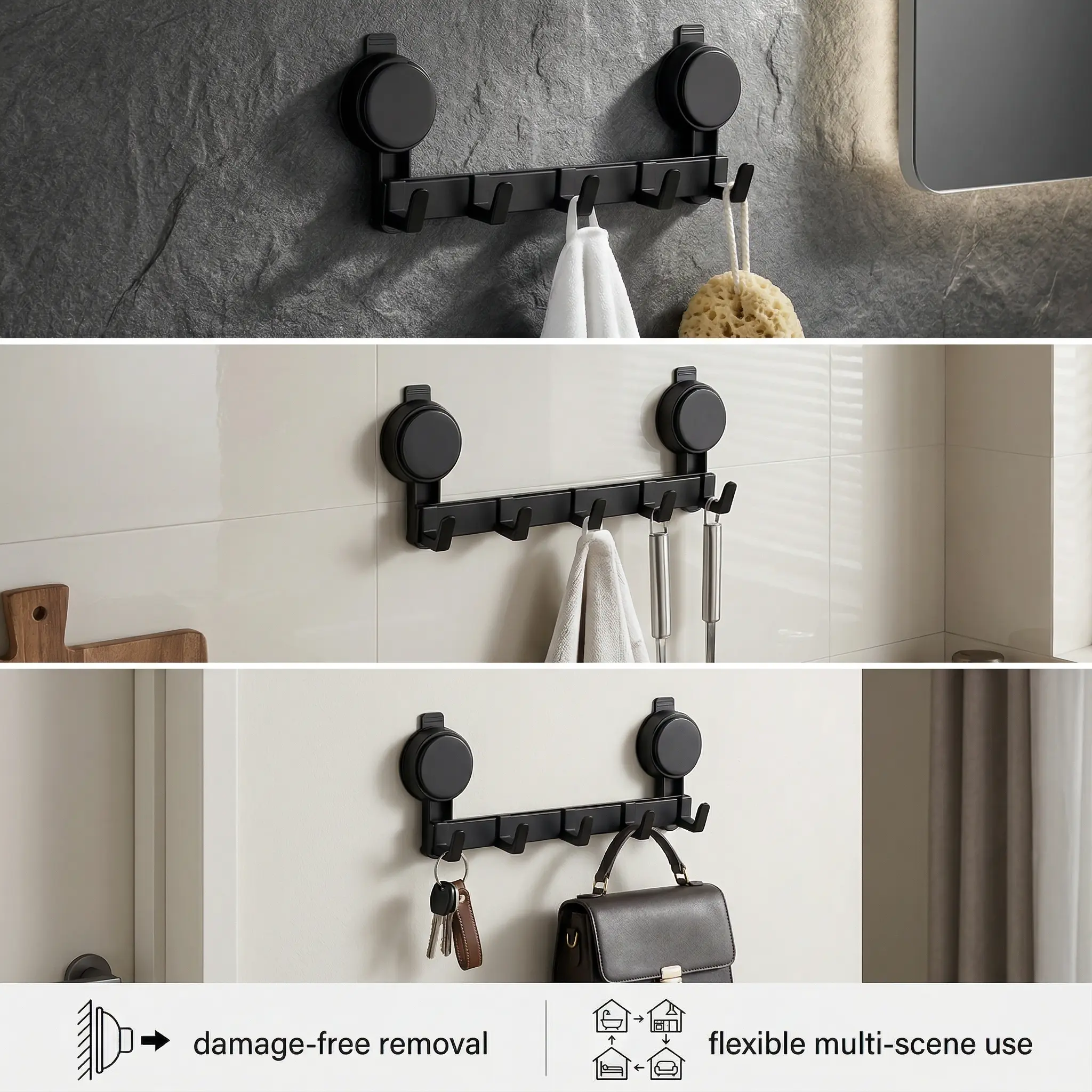 Upgraded vacuum suction cup design, ultra-strong load-bearing capacity. Won't slip or fall even when holding soaking wet thick bathrobes, towels, heavy coats, backpacks or kitchen utensils.
