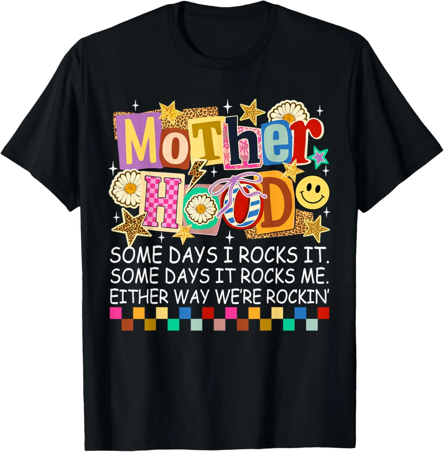 Featuring a playful, colorful retro print of "MOTHERHOOD" with a mix of leopard print, daisies, smiley faces, and the witty slogan "SOME DAYS I ROCKS IT. SOME DAYS IT ROCKS ME. EITHER WAY WE'RE ROCKIN'", this shirt perfectly captures the chaos and joy of mom life. The eye-catching, nostalgic design makes it a relatable, conversation-starting wardrobe staple.