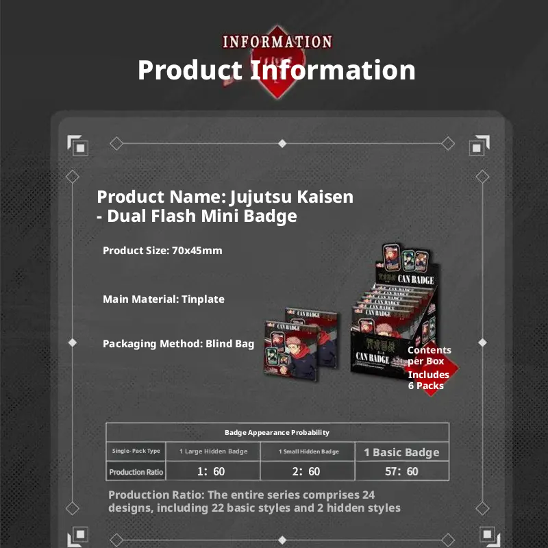 Official Jujutsu Kaisen Season 2 can badges! Collect all 24 designs, including 2 rare secret variants. High-quality tinplate with vibrant character art, perfect for bags, jackets, or collections. Each blind pack is a surprise-grab your favorite sorcerer today!