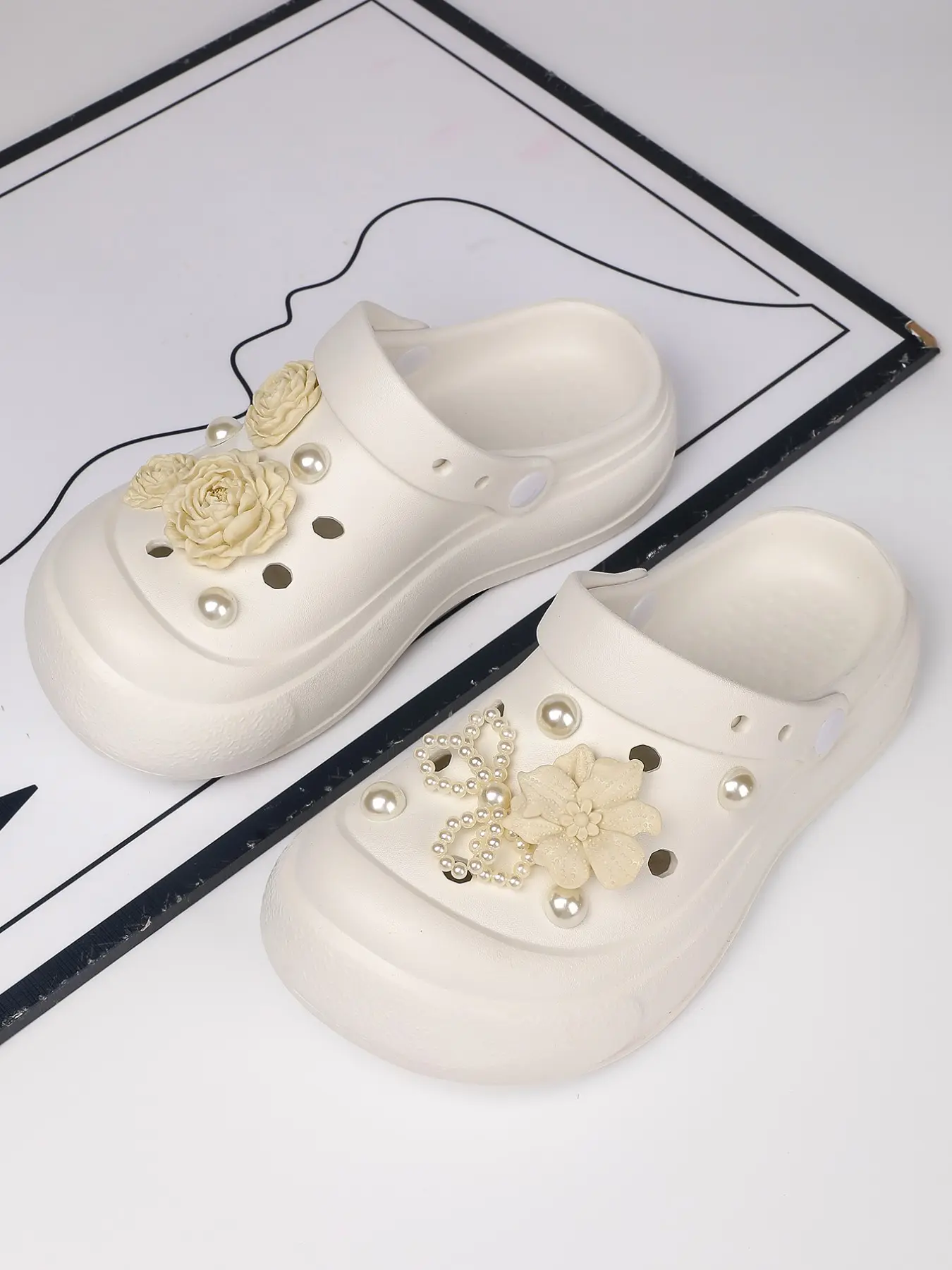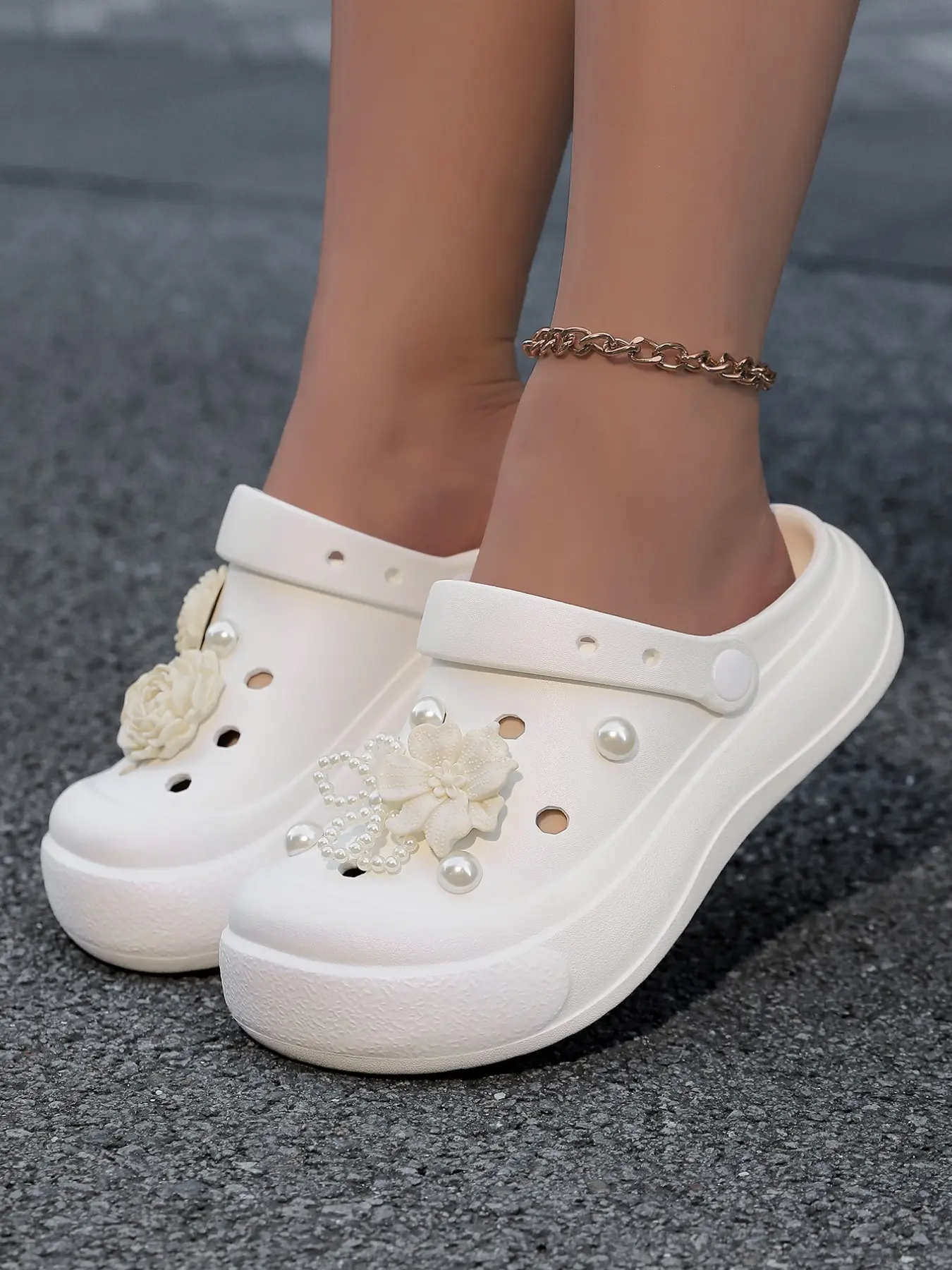 Women's Thick Sole Holey Shoes with Pearl Flowers, Unique Design Versatile Outdoor Sandals, Fashionable and Comfortable Footwear