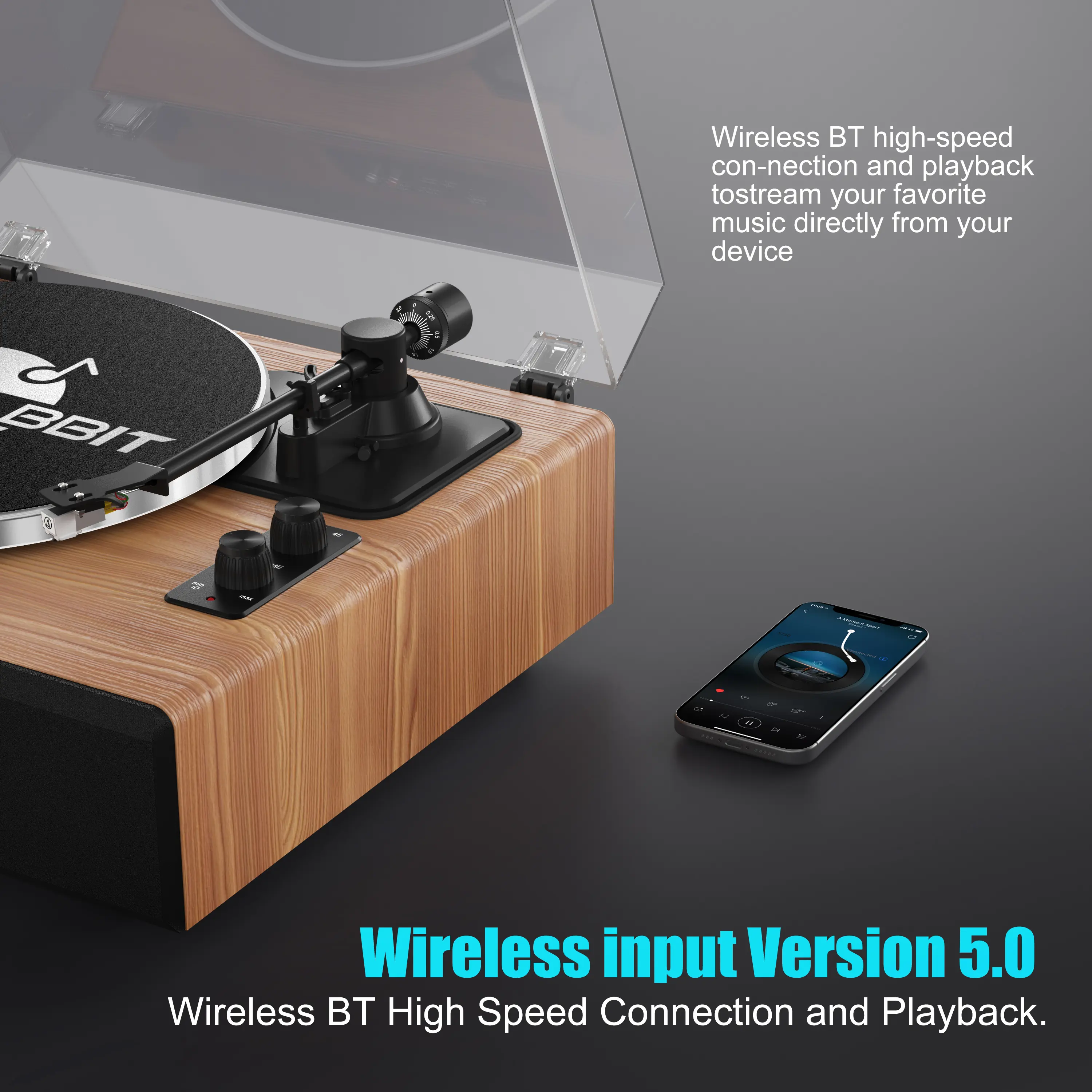 ·【Bluetooth turntable】 This record player built-in Bluetooth 5.0, lets you match your smartphone, tablet, computer or other compatible device and the turntable's speakers play music from other devices wirelessly or through the Aux-in port.