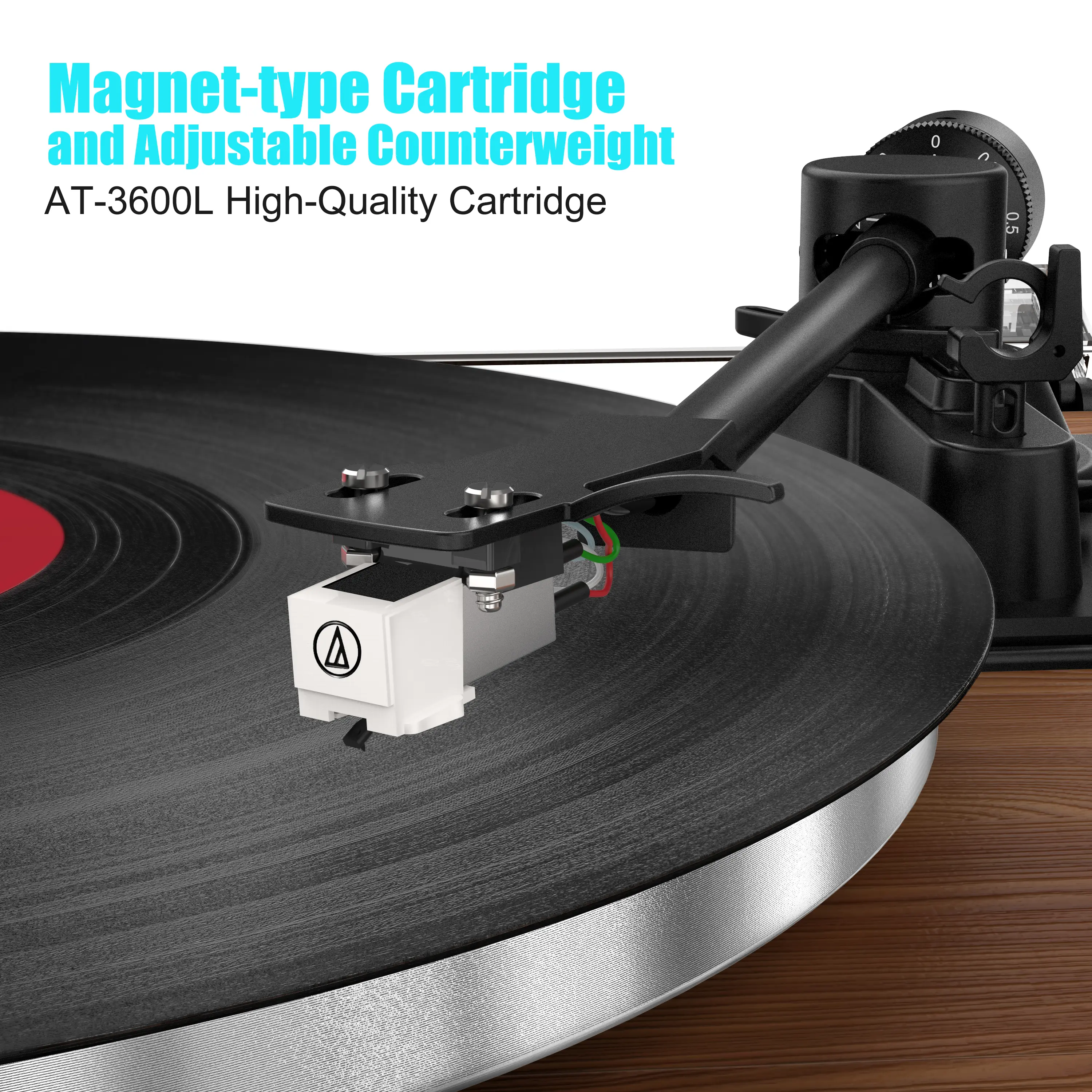 ·【Magnet-type Cartridge and Adjustable Counterweight】 The AT-3600L cartridge can track your record’s grooves with precision for high-definition audio. While a universal headshell allows users to change cartridge stylus easily. The adjustable counterweight makes record player with speakers rich and warm audio freedom from noise and distortion.