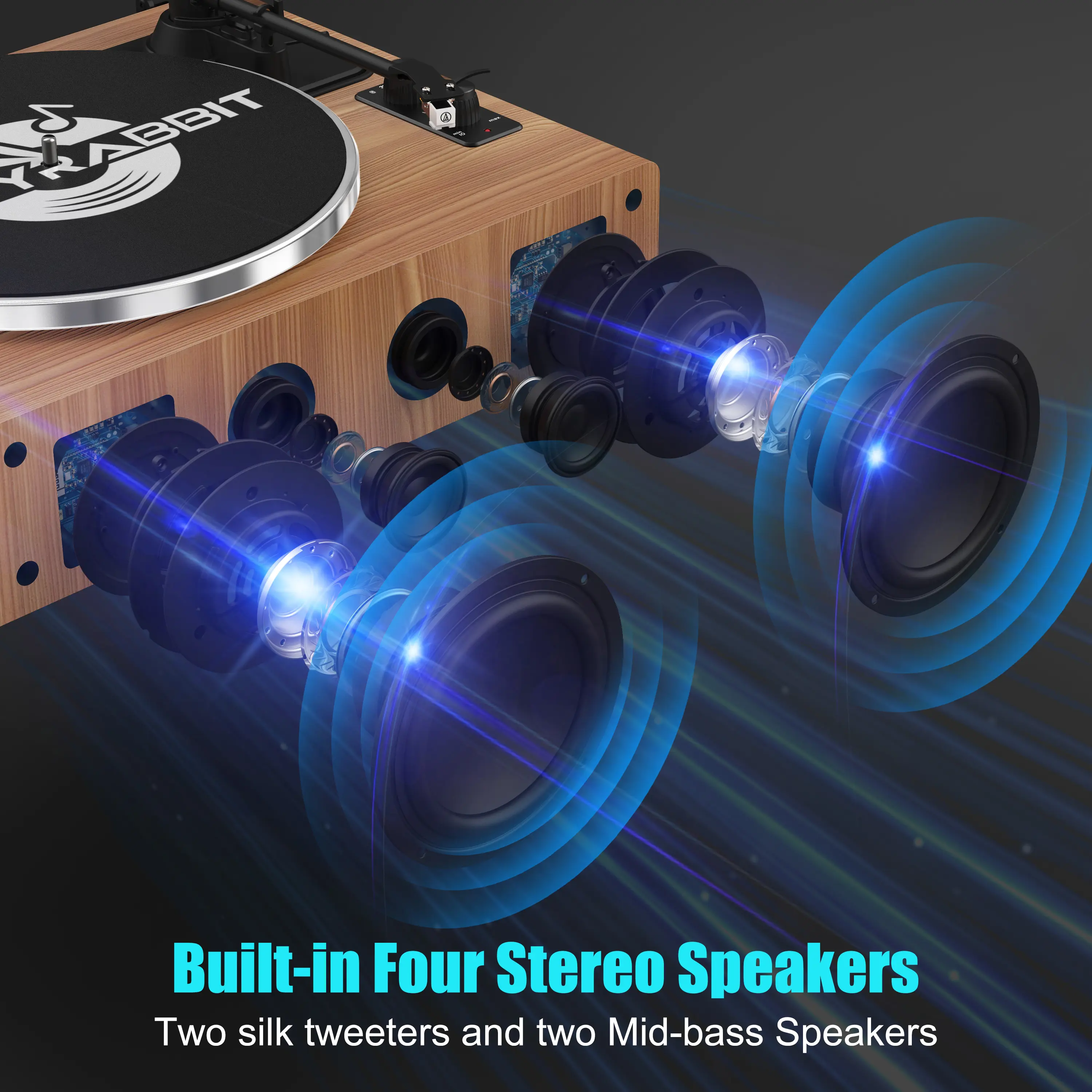 ·【Built-in 4 stereo Speakers】The vinyl record player with built in 2 silk tweeters and 2 mid-bass speakers produce natural, well-balanced studio sound with massive bass, sounds with minimal distortion and decent tonal quality.