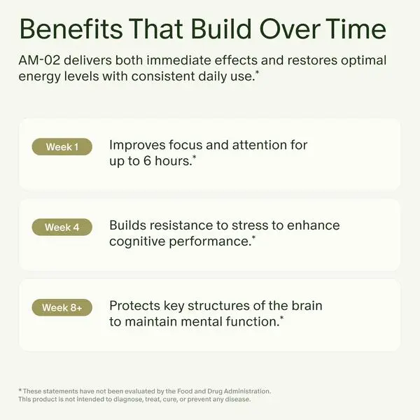 ·Getting Started: Daily use unlocks the full benefits of AM-02. When and how you feel results may vary based on your body. Take one capsule in the morning within 2 hours of waking up and repeat daily. Safe to take with coffee or tea.