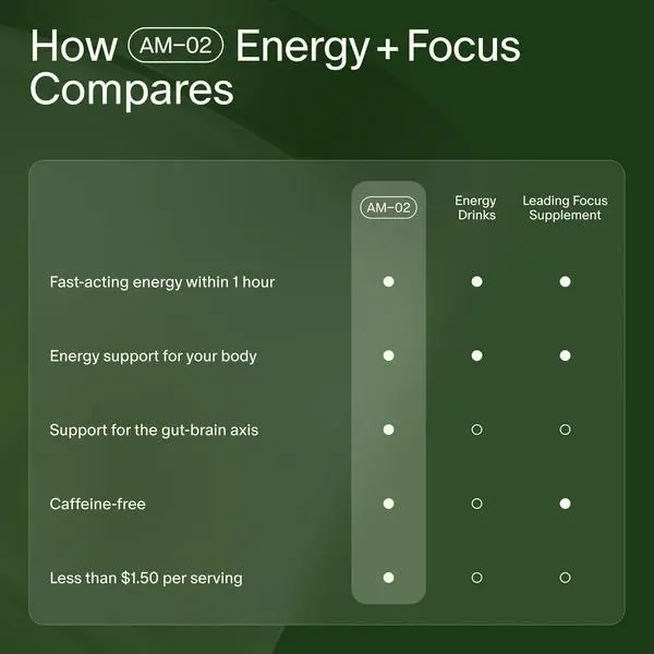 ·Lasting Energy—Without the Crash: Unlike caffeine-loaded solutions that hit hard and burn fast, AM-02’s Multi-Peak Energy Complex activates and tapers at just the right intervals, for a balanced, gradual mental lift without the jitters, slumps, or crashes.