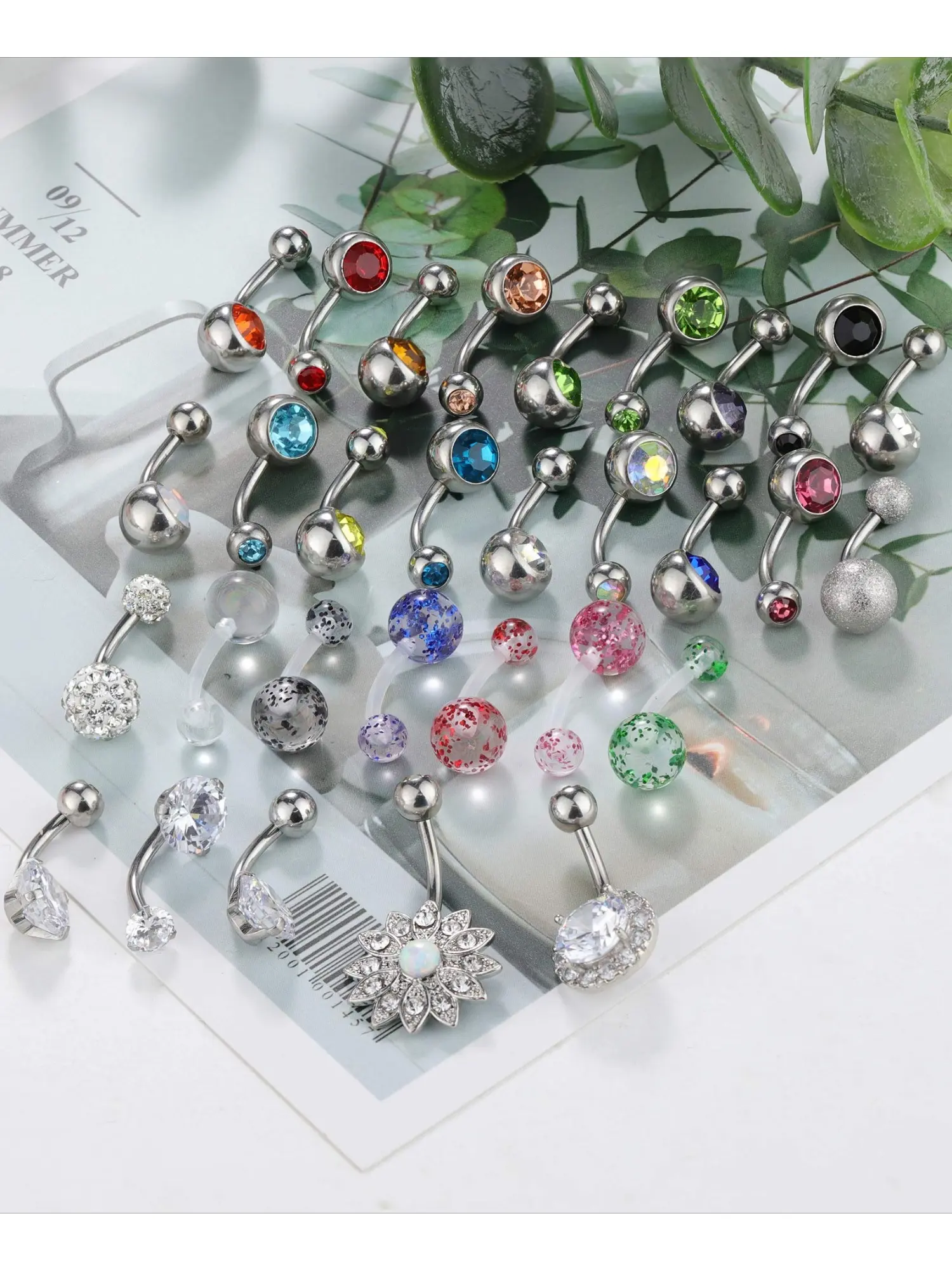 30 Pcs Vibrant Multicolor Belly Button Ring Pack for Women Men Premium Stainless Steel Hypoallergenic Comfortable Long-time Wearing Shiny Cubic Zirconia Bright Acrylic Details with Fashionable Dangle Styles for Summer Beach Daily Wear