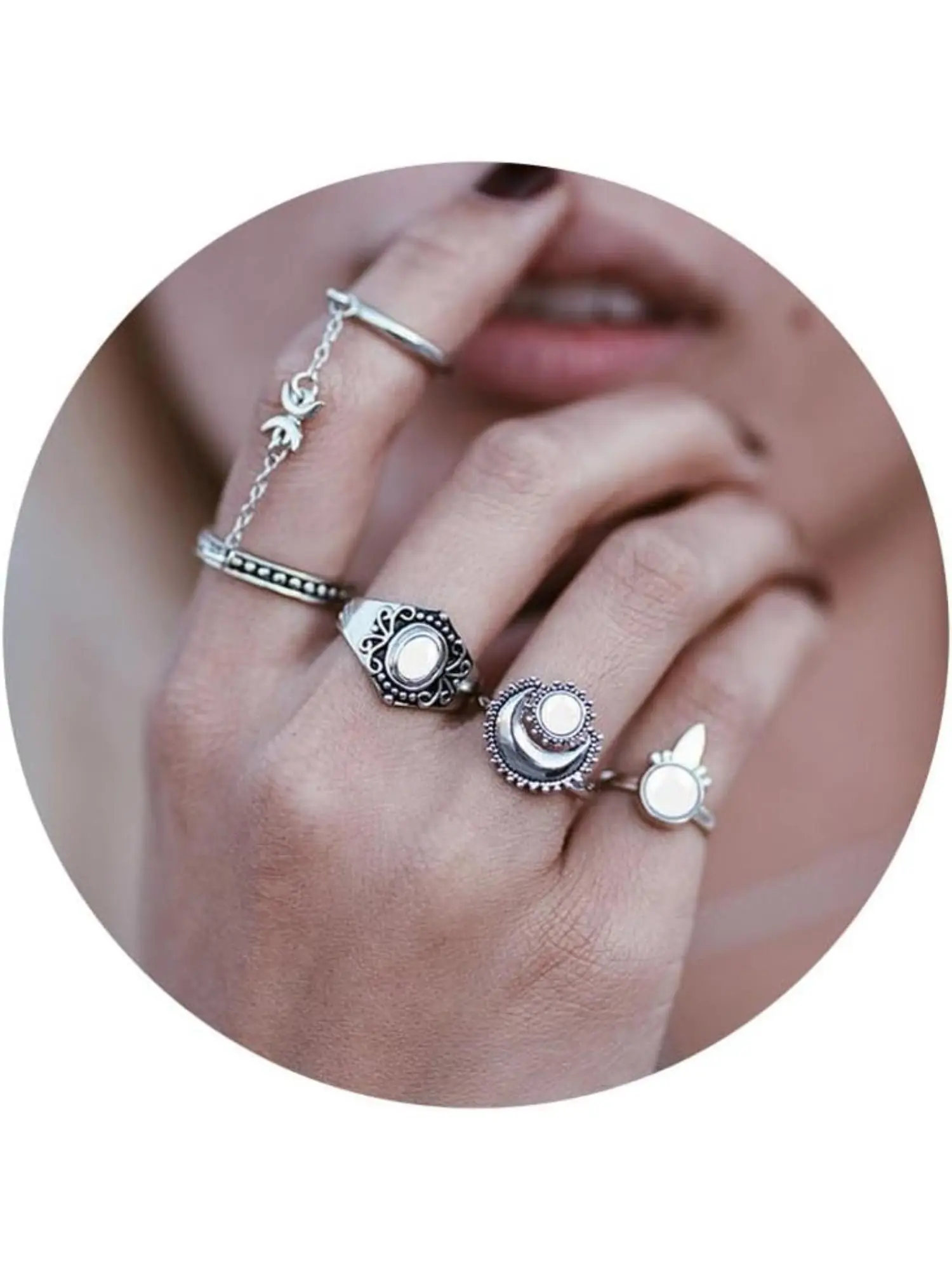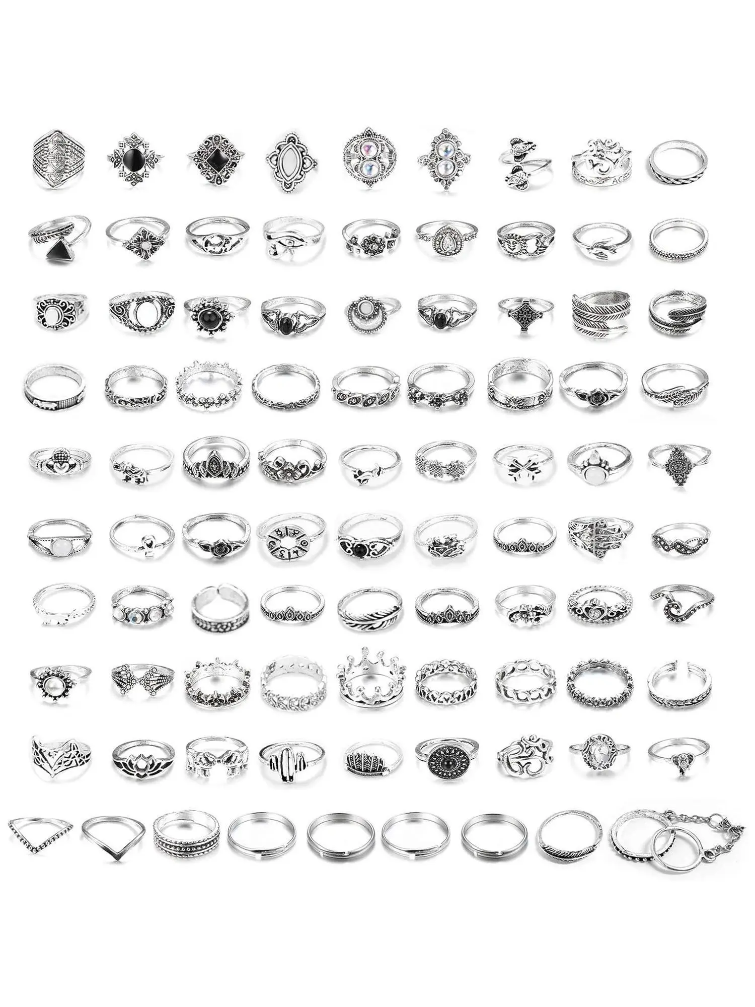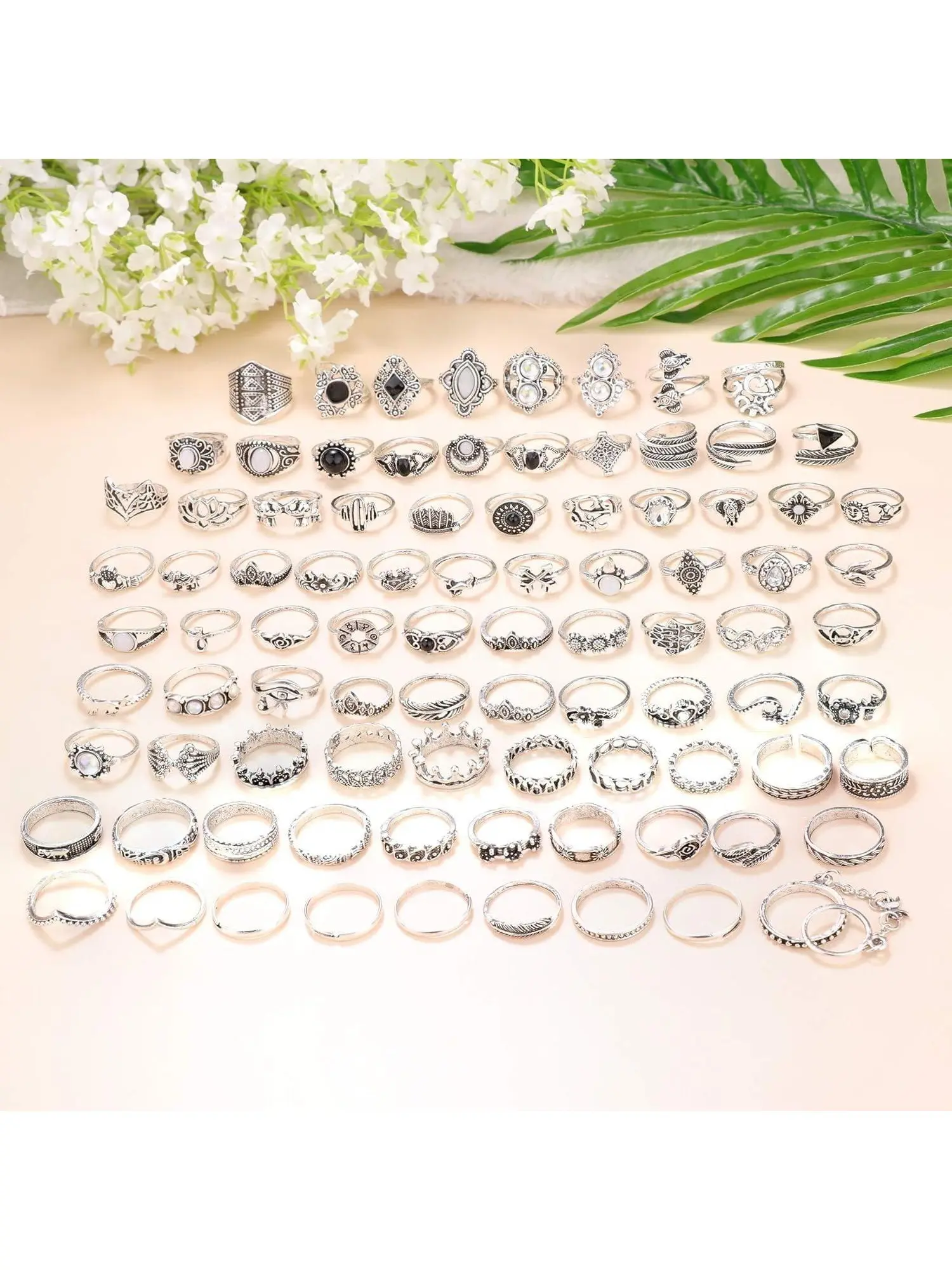 90 Pcs Vintage Silvery Stackable Ring Set for Women Men Bohemian Retro Midi Knuckle Rings Pack Hypoallergenic Alloy with Floral Geometric Snake Moon Patterns Punk Boho Style Jewelry Perfect for Daily Outfits Parties Gifting