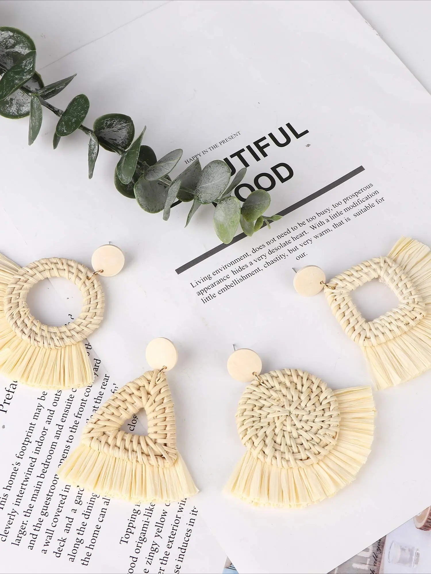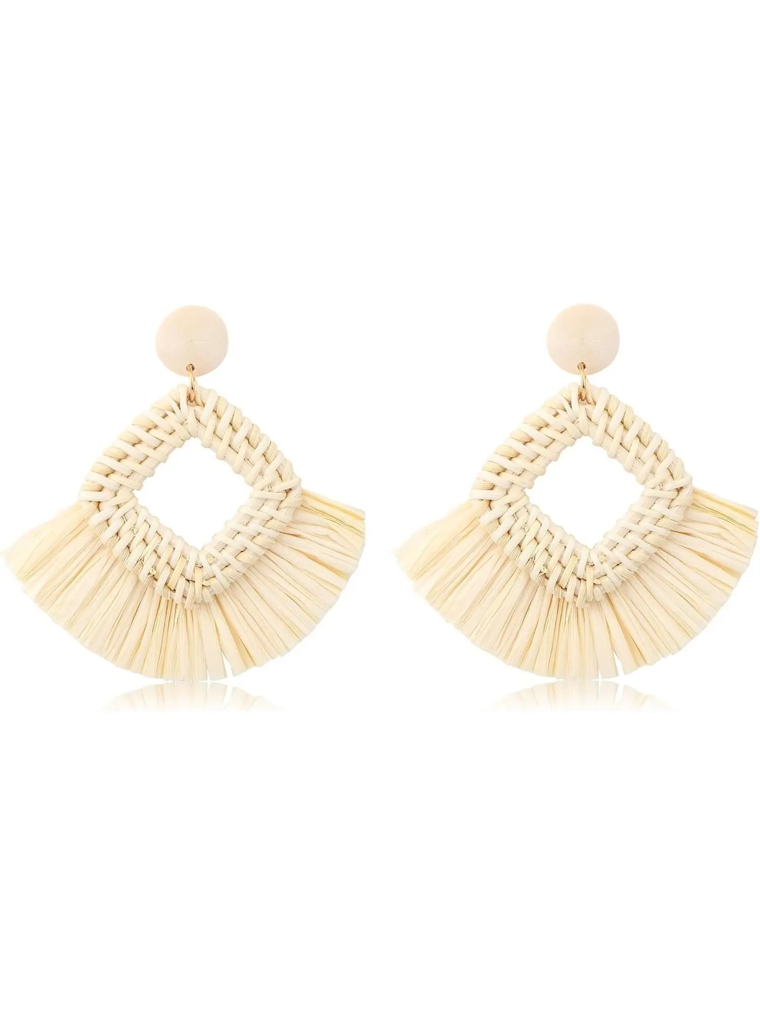 1 Pair Bohemian Beige Rattan Raffia Fringe Dangle Earrings for Women Men Handmade Natural Woven Straw with Elegant Wooden Decor Lightweight Fashionable Hypoallergenic Posts Provide Safe Comfortable Wearing Experience