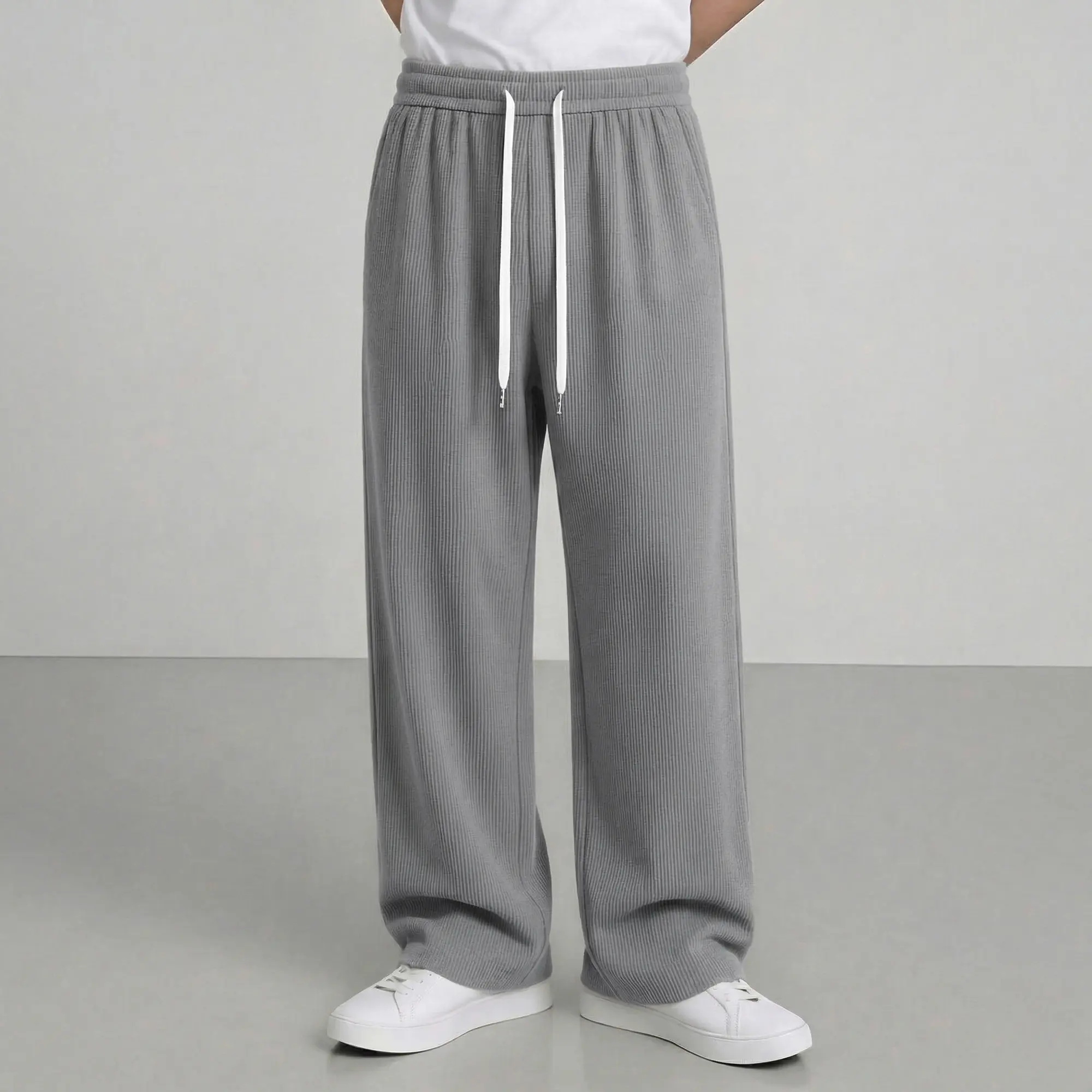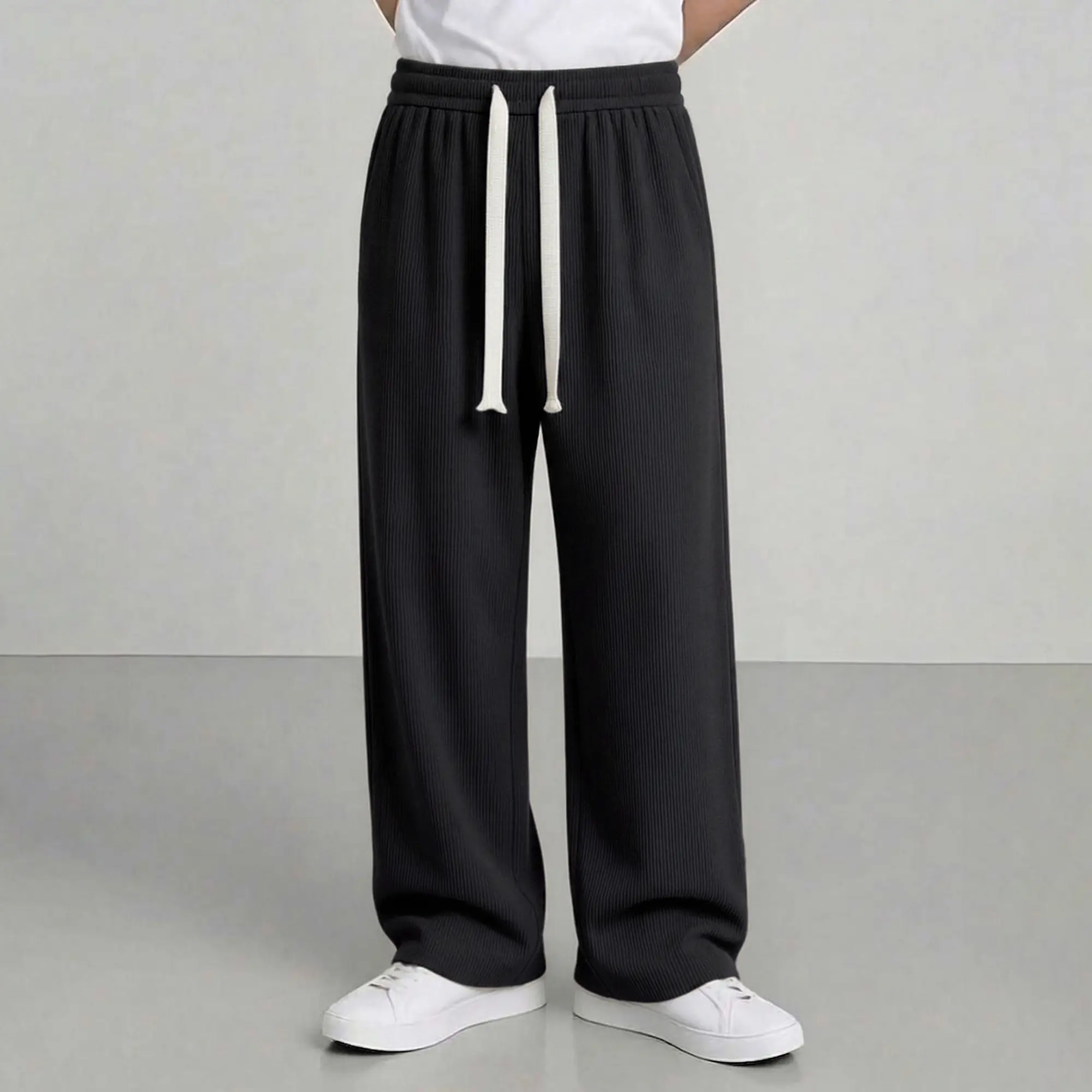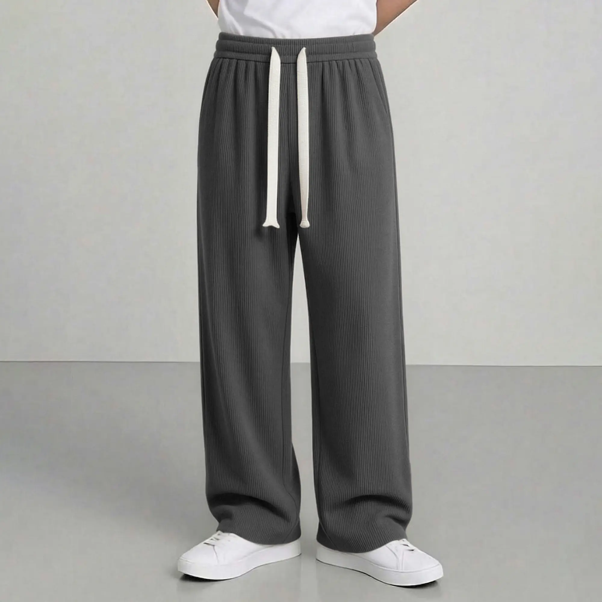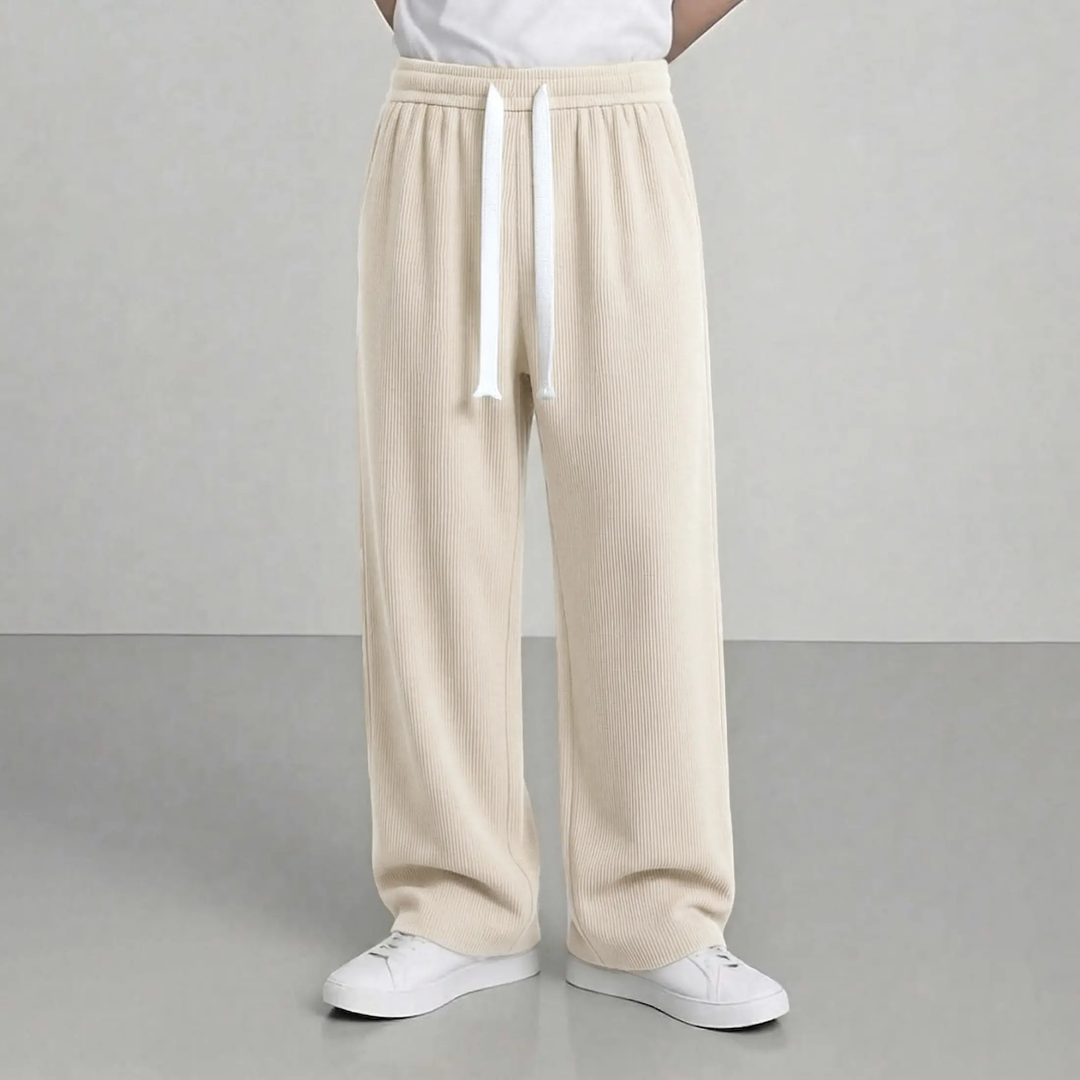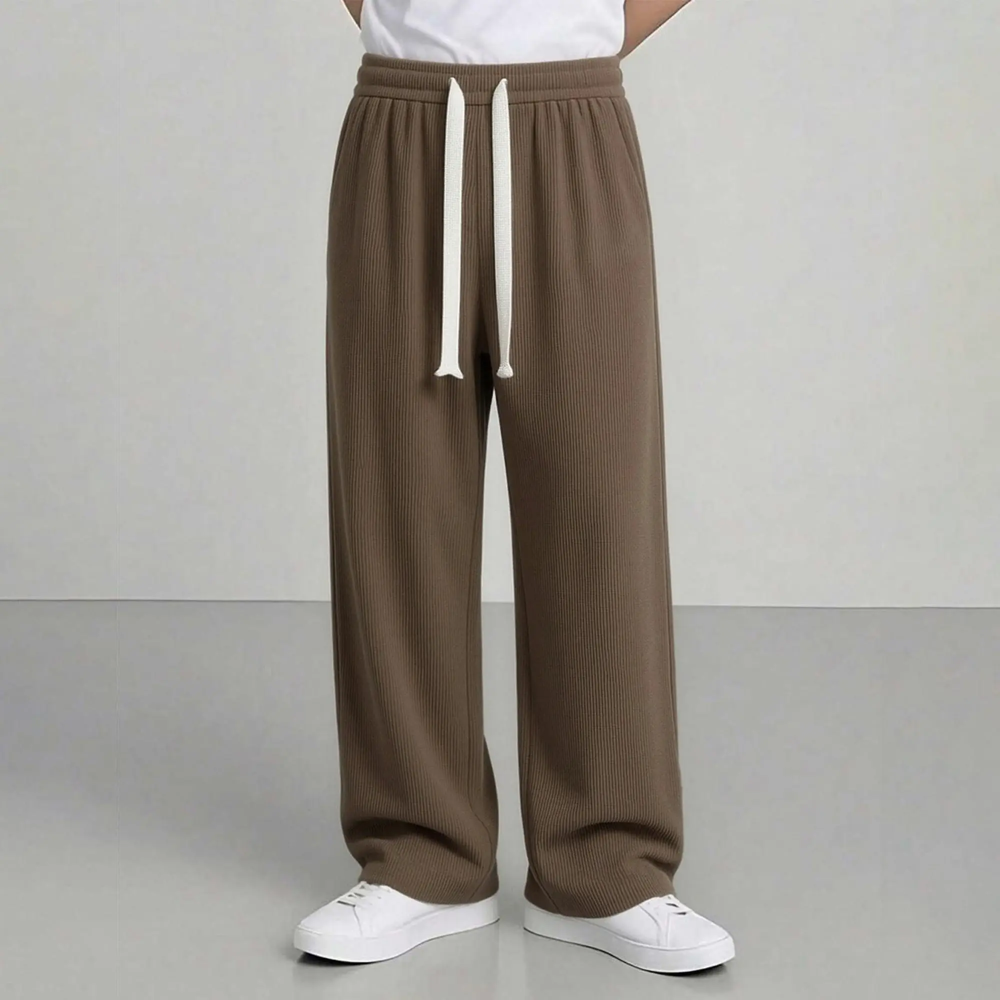 Men’s American vintage corduroy straight-leg pants—trendy, versatile brown casual long trousers with a drawstring waist and loose fit; simple, stylish men’s bottoms suitable for everyday wear and sports.