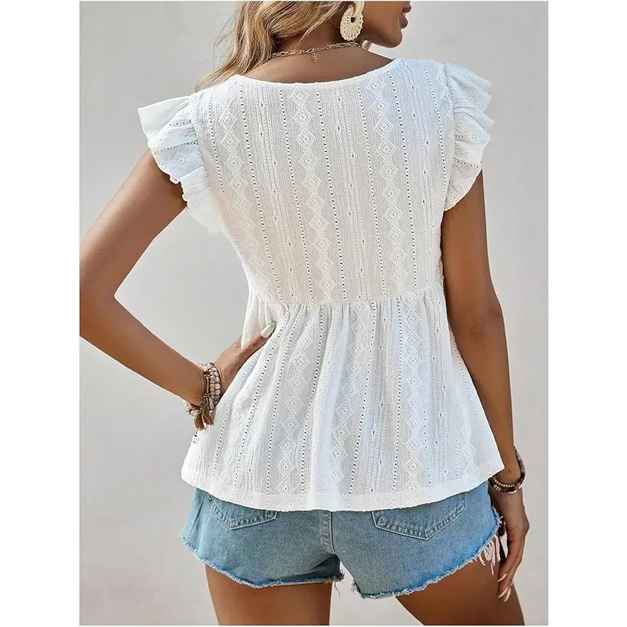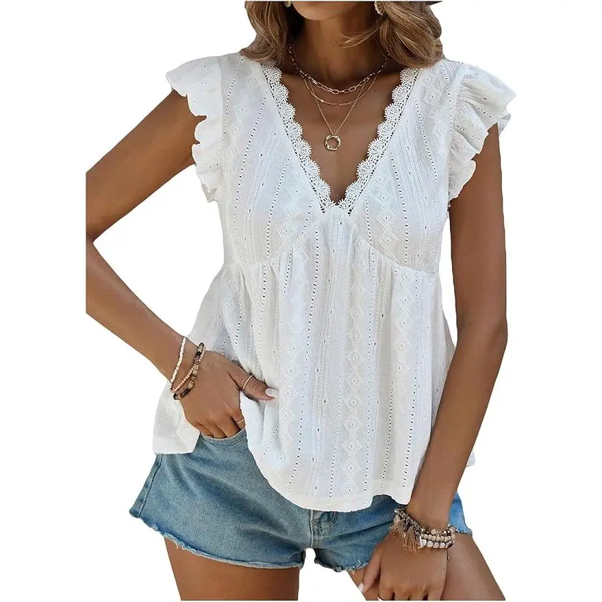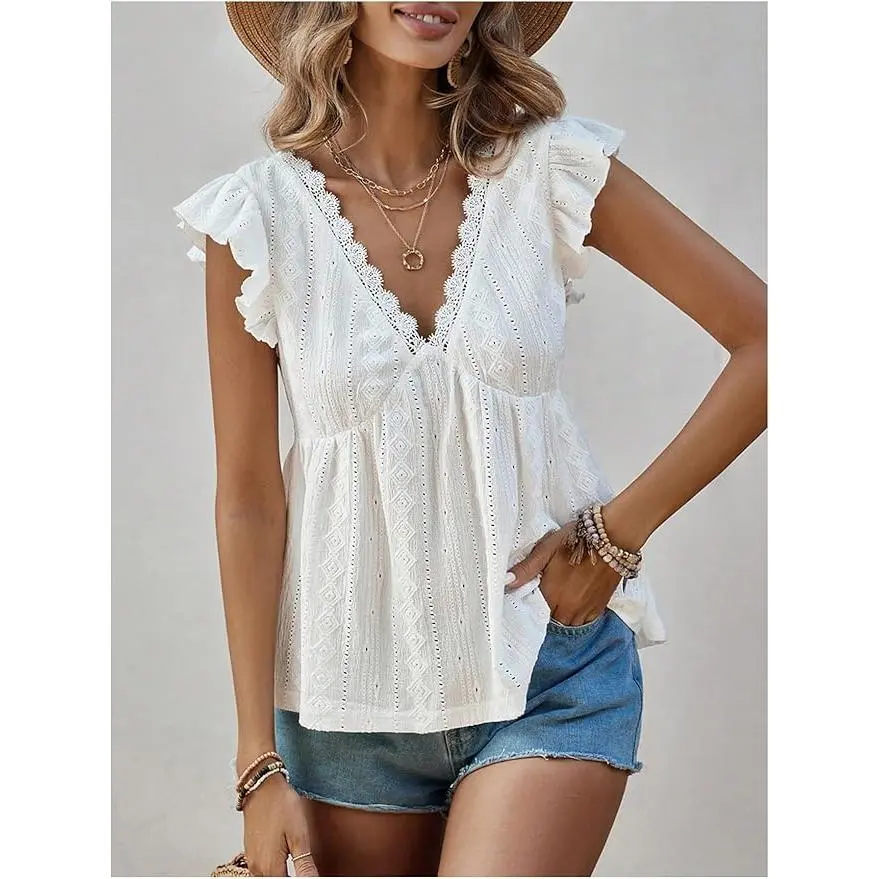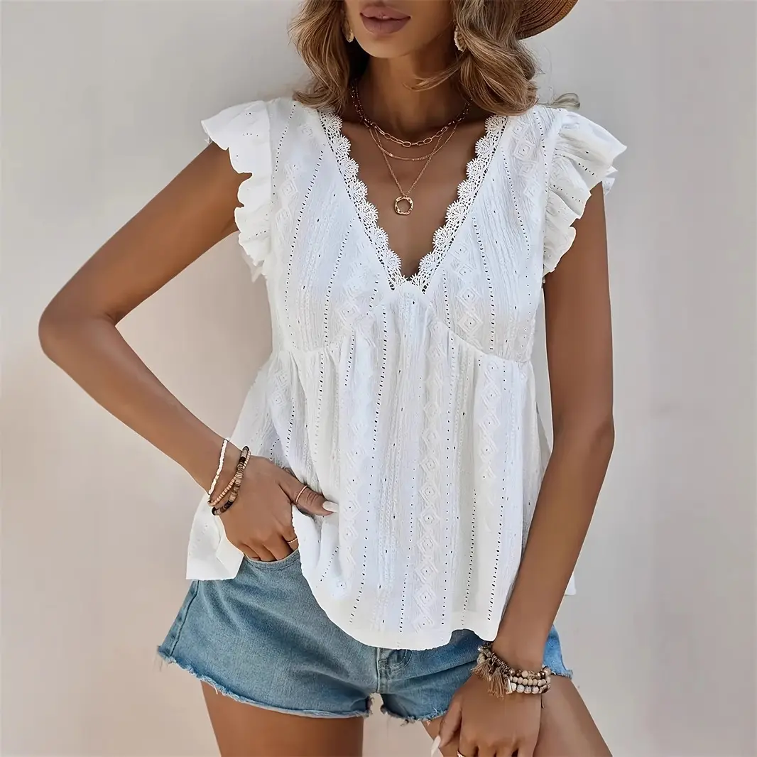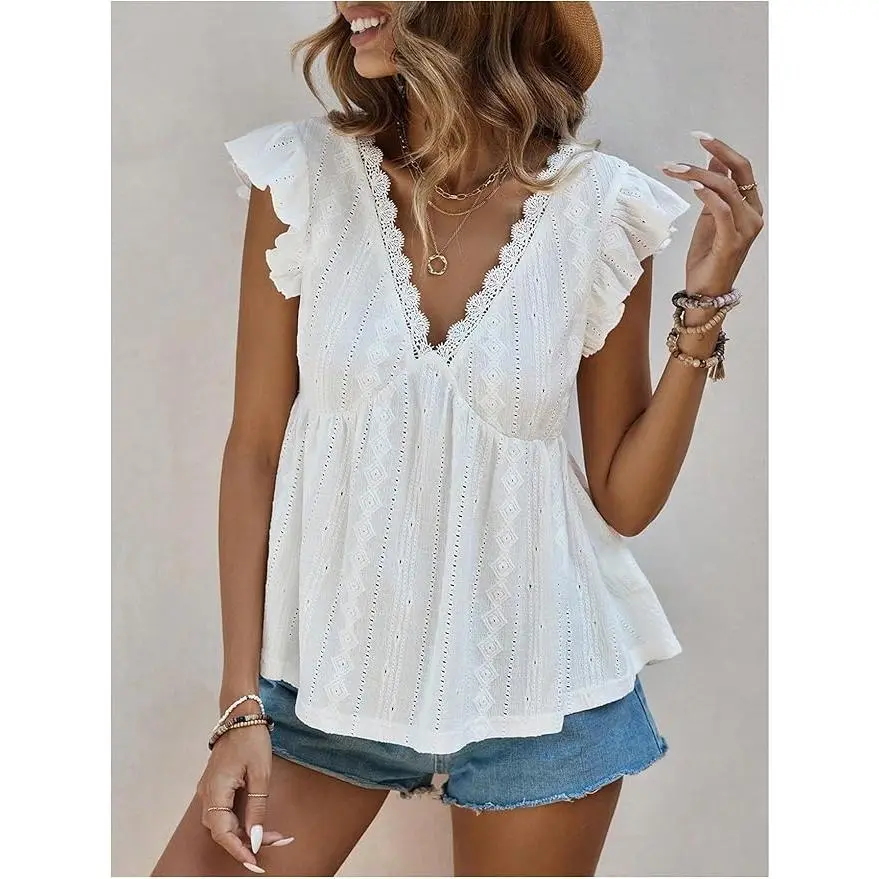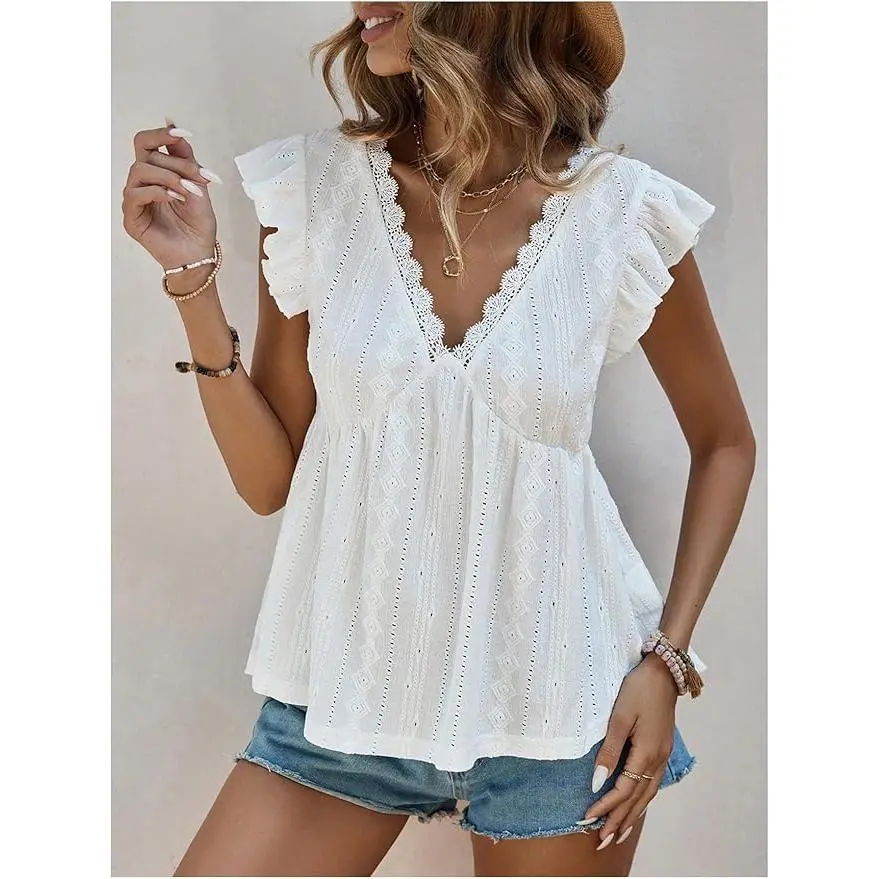 Women's Lace Trimmed V Neck Ruffled Sleeve Flared Eyelet Tank Blouse Top