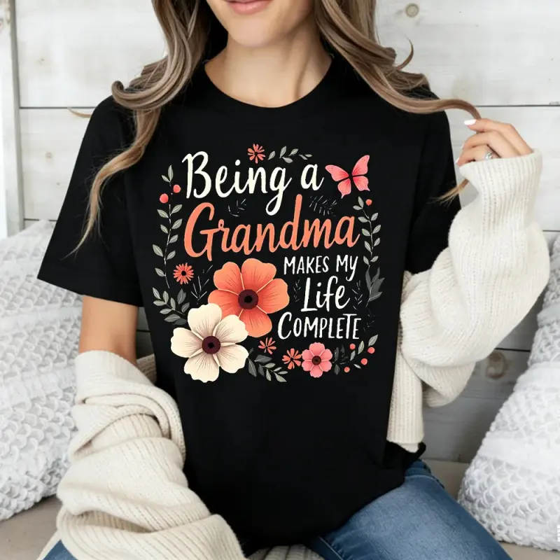 Being A Grandma Makes My Life Complete Floral Butterfly Print T Shirt Black Casual Loose Fit Tee For Women Perfect For Everyday Wear And Leisure Activities