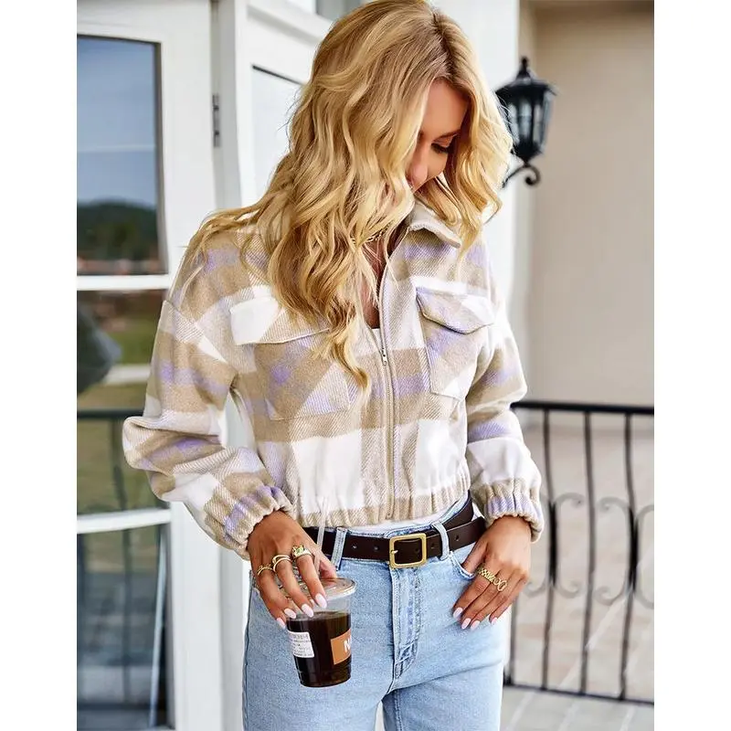 NewWomens Cropped Flannel Plaid Shacket Zip Up Shirts Jackets with Pockets Can be used with a raincoat