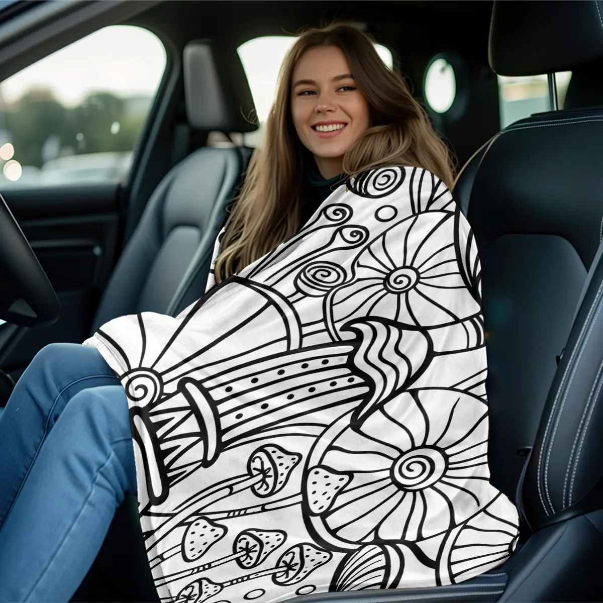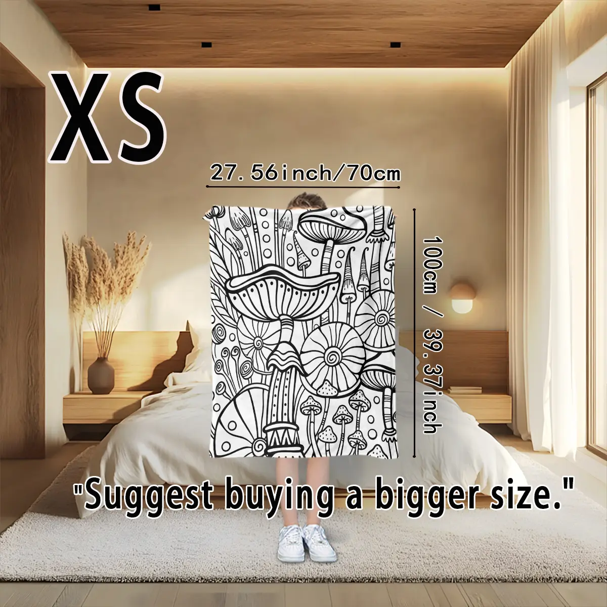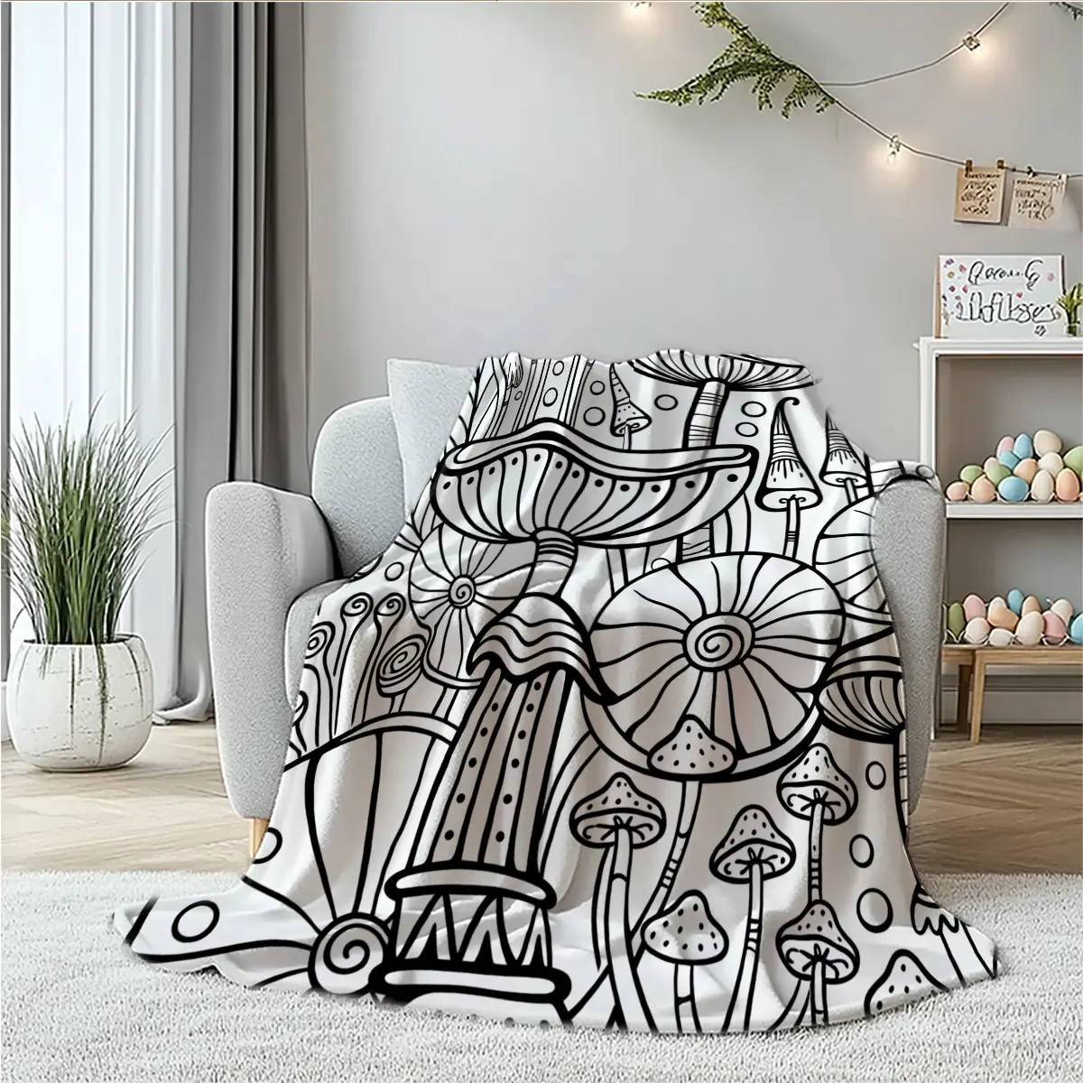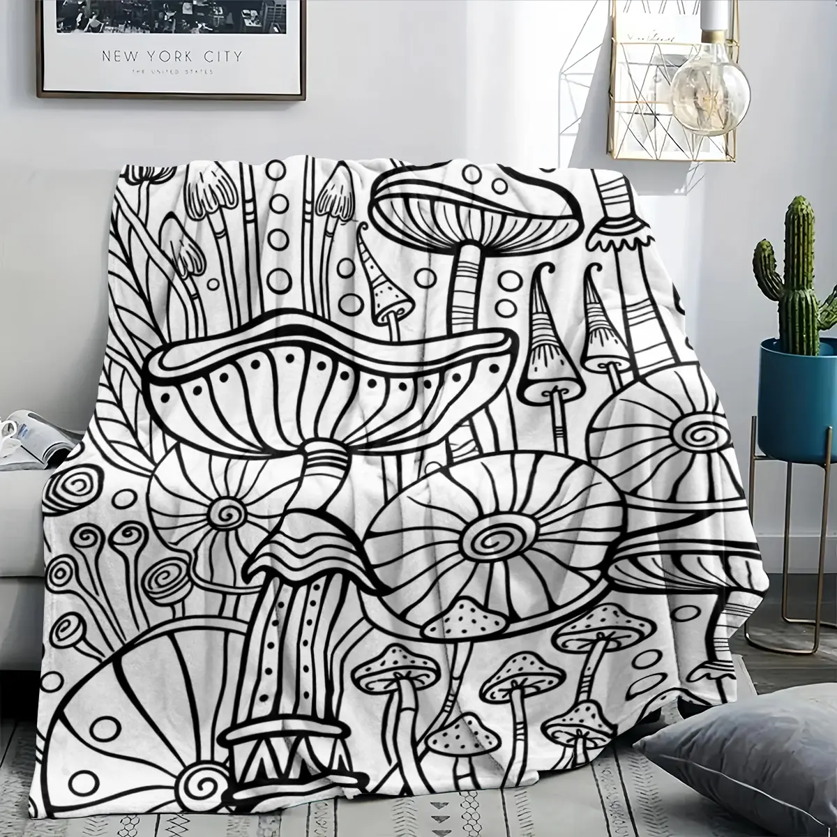 Black-and-white line art mushroom forest flannel blanket — sofa throw, bedspread, air-conditioning blanket; suitable for Bohemian, wabi-sabi, and minimalist bedrooms/living rooms; targets art lovers, craft enthusiasts, mushroom aficionados, and Bohemian h