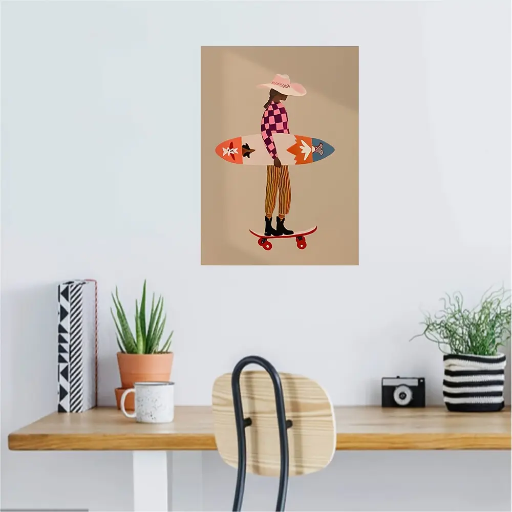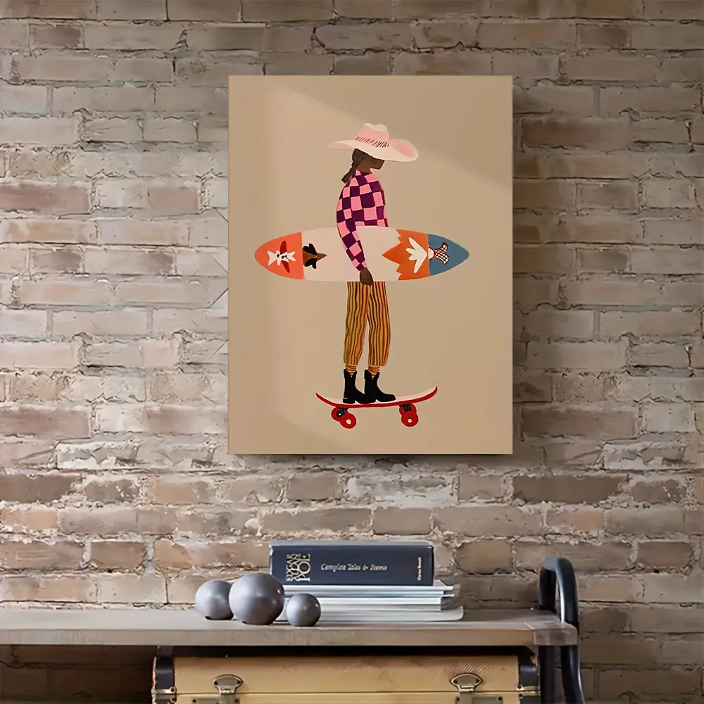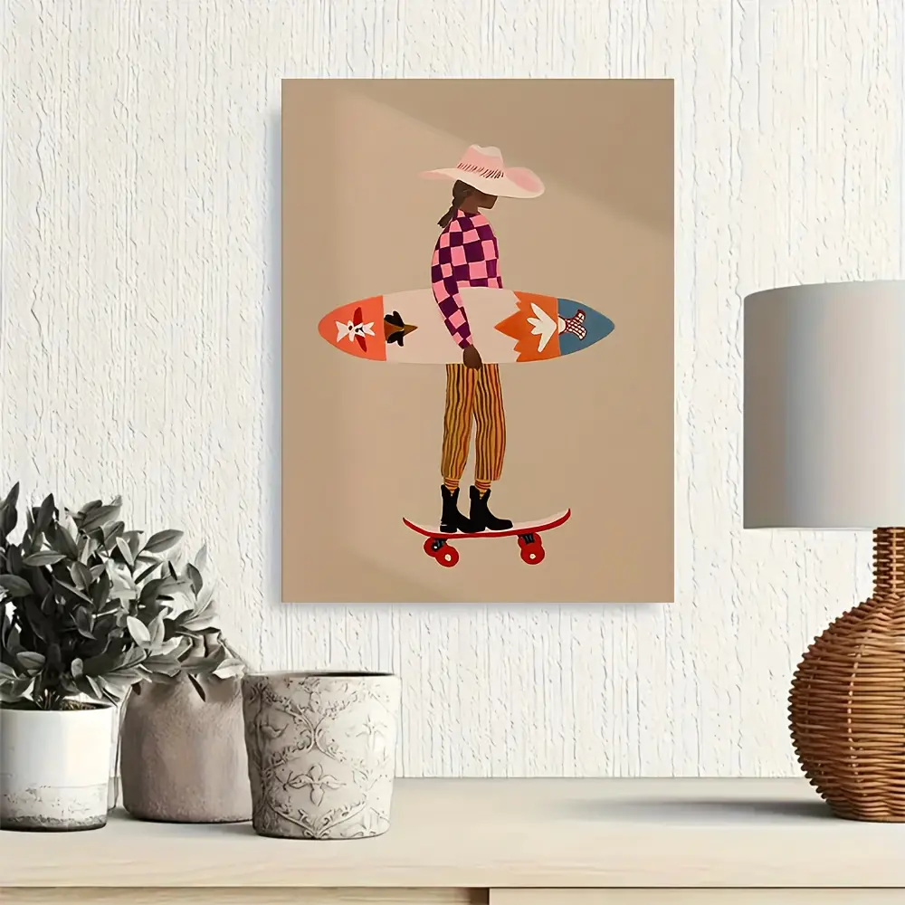 [1pcs] Framed Canvas Painting, Pink Surfer Print Skateboard Beach Art Checkered Pattern Modern Coastal Decor Folk Art Wall Art , 2D Flat, Perfect for Room Decor