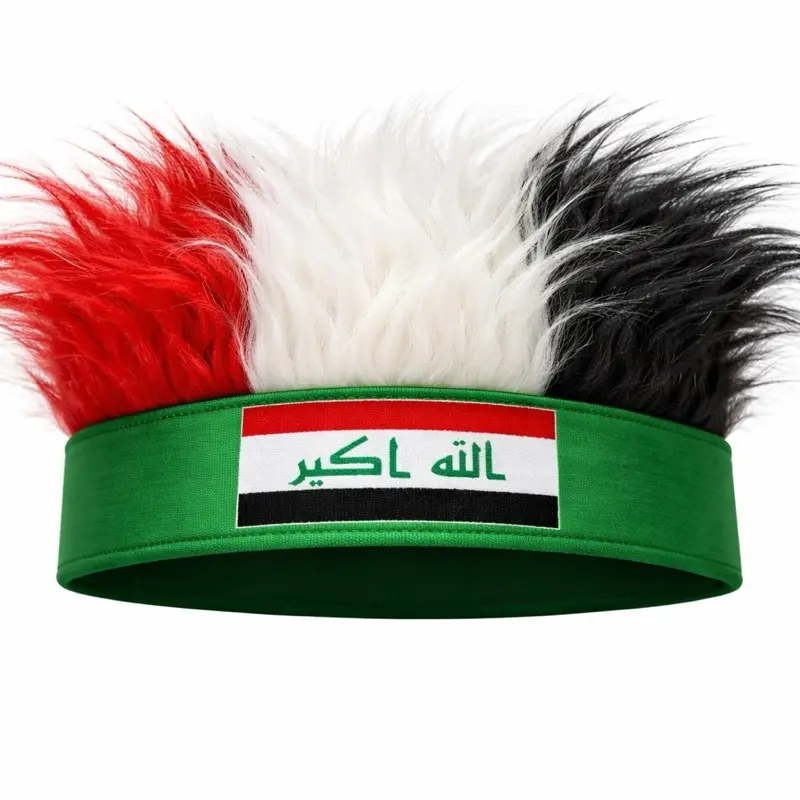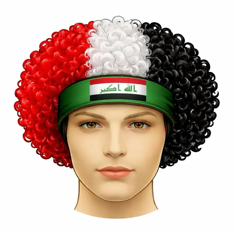 Turn heads with this Iraq-inspired fan style featuring a curly afro in red, white, and black 🇮🇶, paired with a green headband carrying the spirit of Iraq.