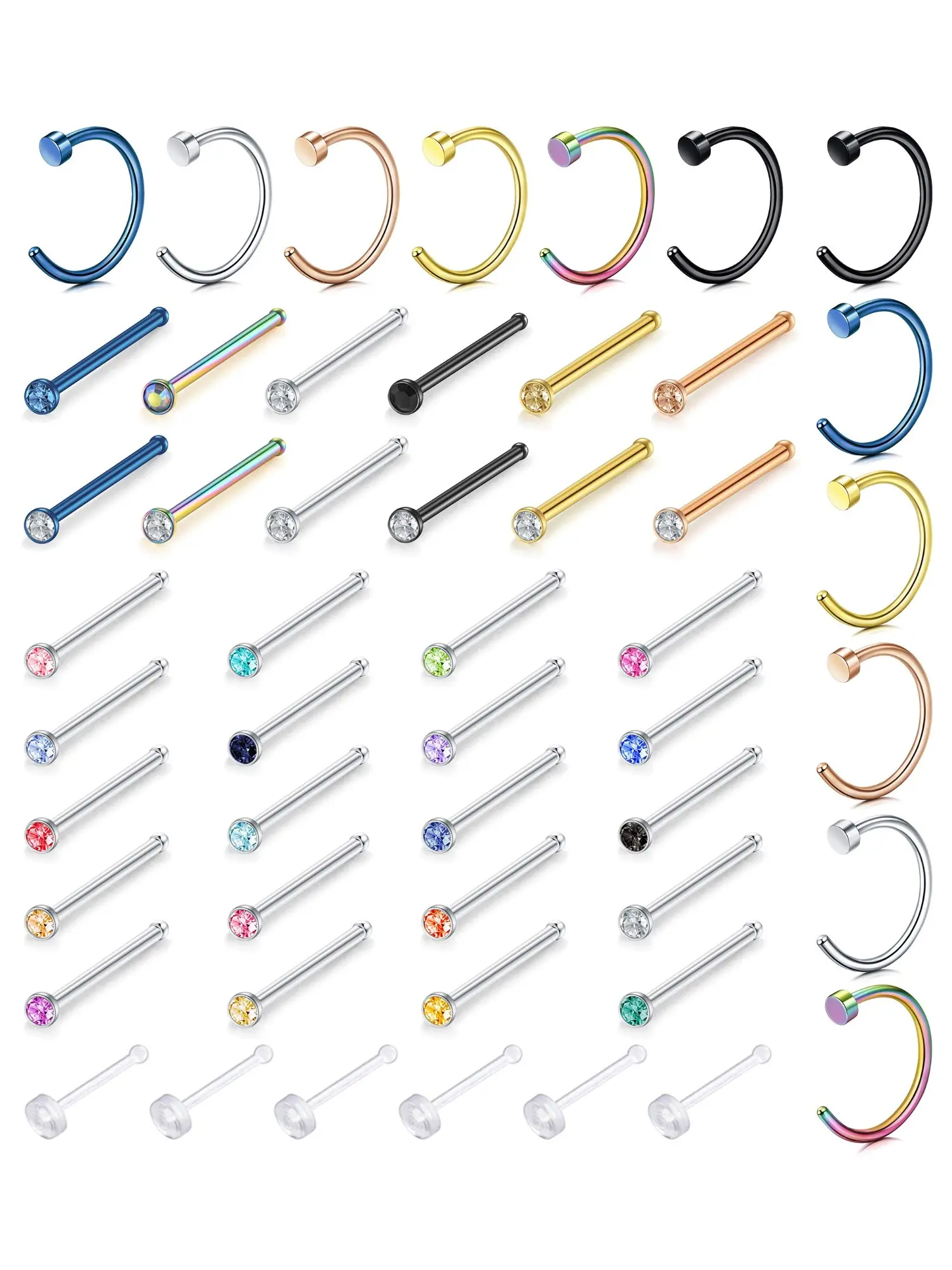 50 Pcs Colorful Classic Nose Piercing Set for Women Men Simple Fashionable Jewelry Options Assorted Collection Sparkling CZ Nose Studs Curved Nose Rings Discreet Clear Acrylic Retainers for Multiple Occasions Daily Wear Parties Vacations Formal Events