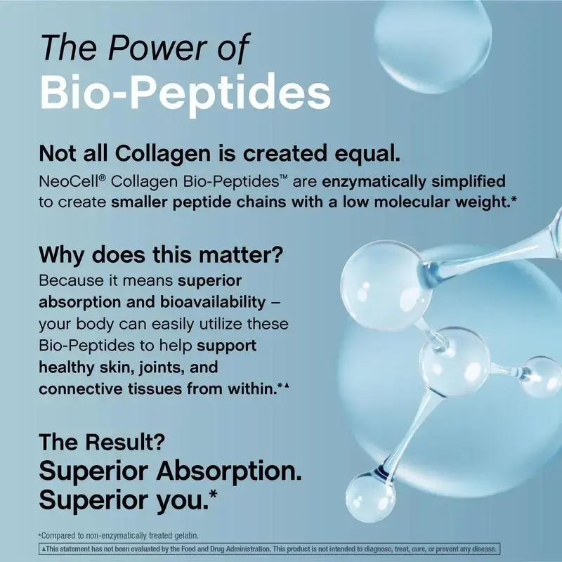 NeoCell Collagen Bio-Peptides are enzymatically simplified to create smaller peptide chains with a low molecular weight. * Why does this matter? Because it means superior absorption and bioavailability, your body can easily utilize these Bio-Peptides to help support healthy skin, joints, and connective tissues from within. *▲