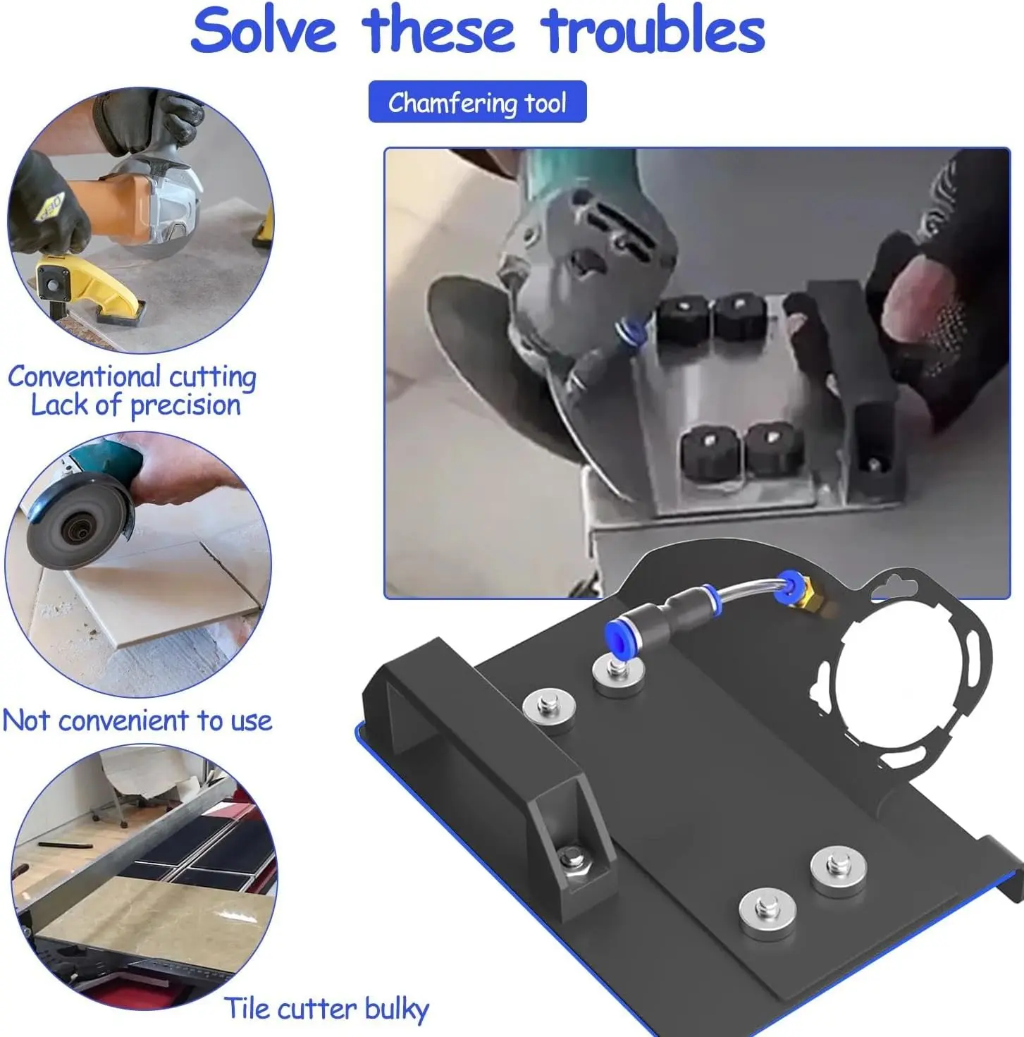 Transform your 100 type angles grinder into a precise tile chamfering tool with our Adjustable Angles Grinder Stand, ensuring professional 45° cut