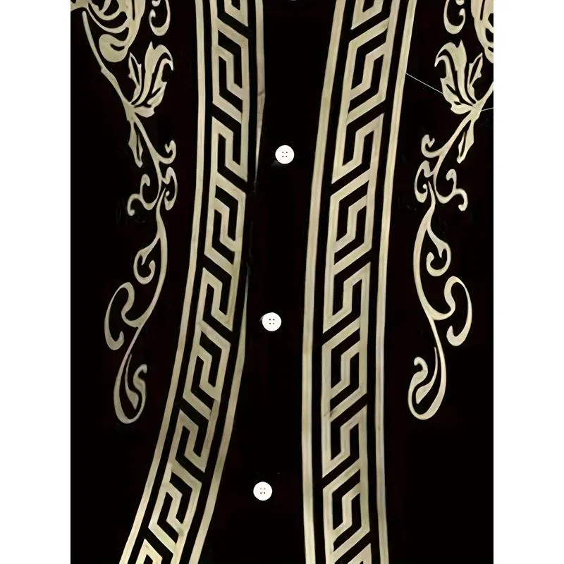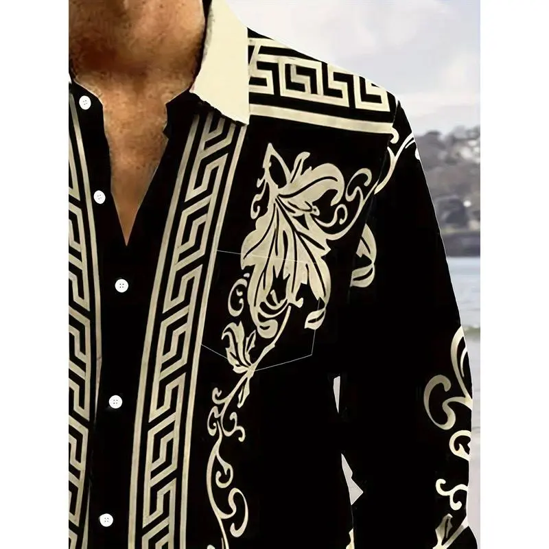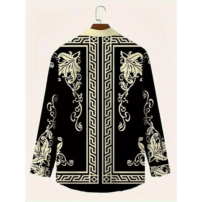 Men'S Plus Size Hawaiian Baroque Floral 3D Print Long Sleeve Button-Up Shirt with Pockets - Vintage Style, Black & White Design, Chest Pocket, Retro Collar, Non-Stretch Fabric, Perfect for Fall, Hawaiian Shirt, PLUS SIZE Menswear Top