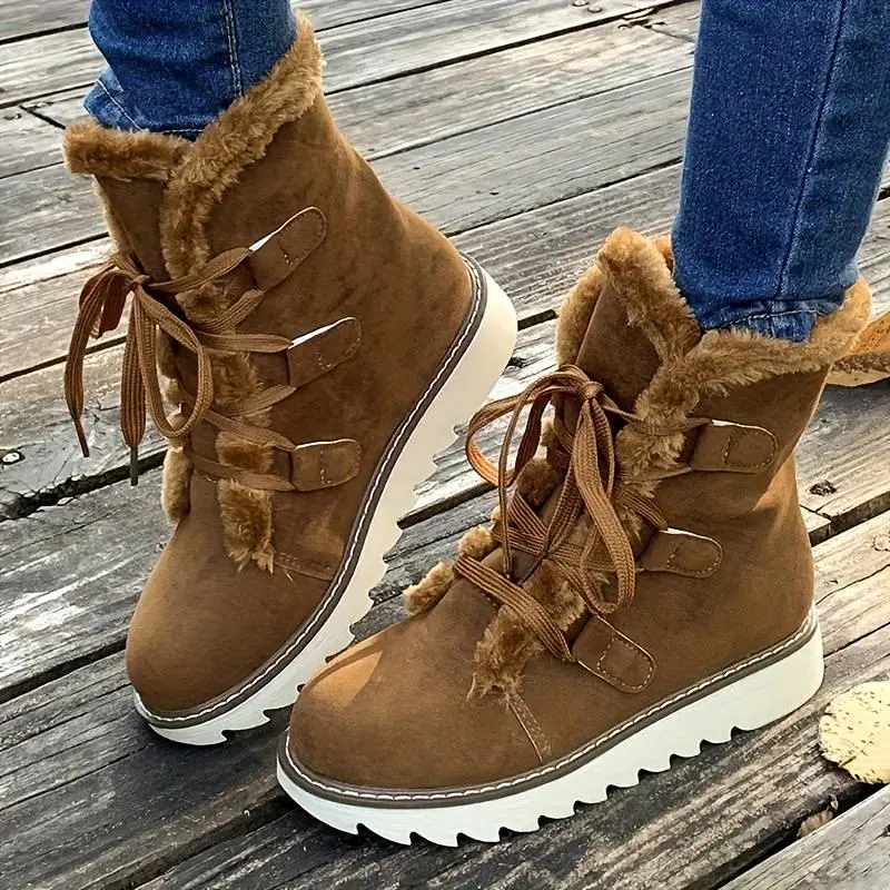 Women's Plush Lined Snow Boots, Pure Color Tied Outdoor Non-Slip Boots, Winter Warm Outdoor Mid-Calf Boots