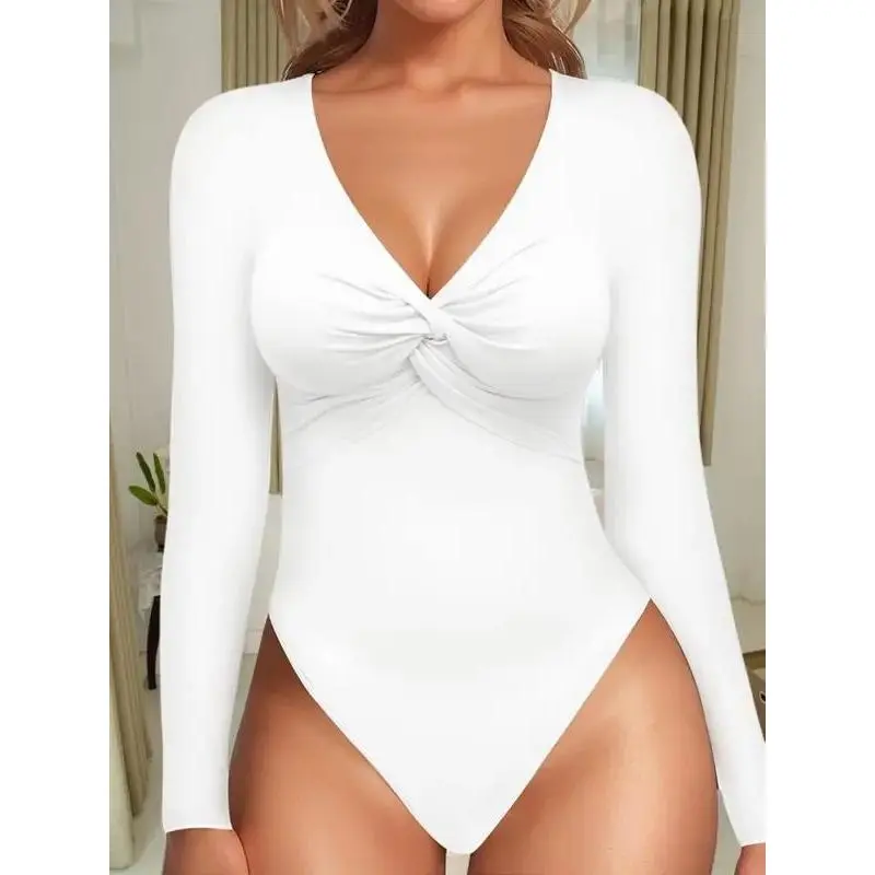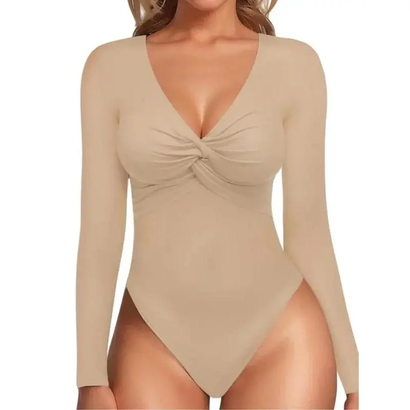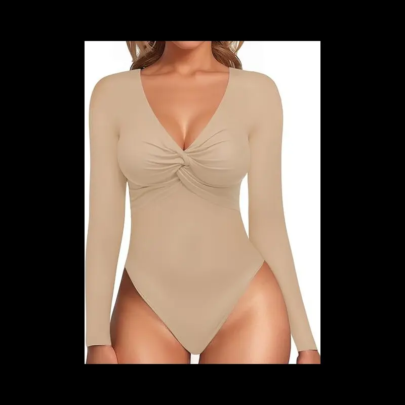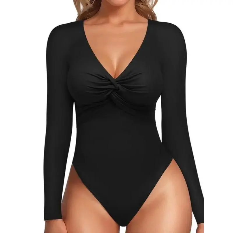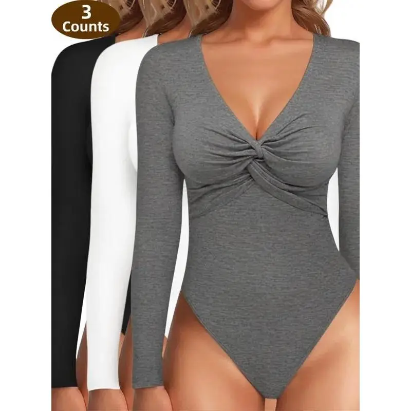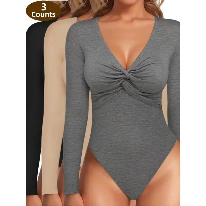 LuxeCurve3CountsWomen'sSexyTwistFrontVNeckLongsleeveSlimFitTrendyTopsBasicComfort,LadiesWearingWarmUndergarmentsOutside,Slim-FittingCasualBaseLayerforSpring&Fall,FashionWomen'sTopSuitableforDailyWear Bodysuit Womenswear