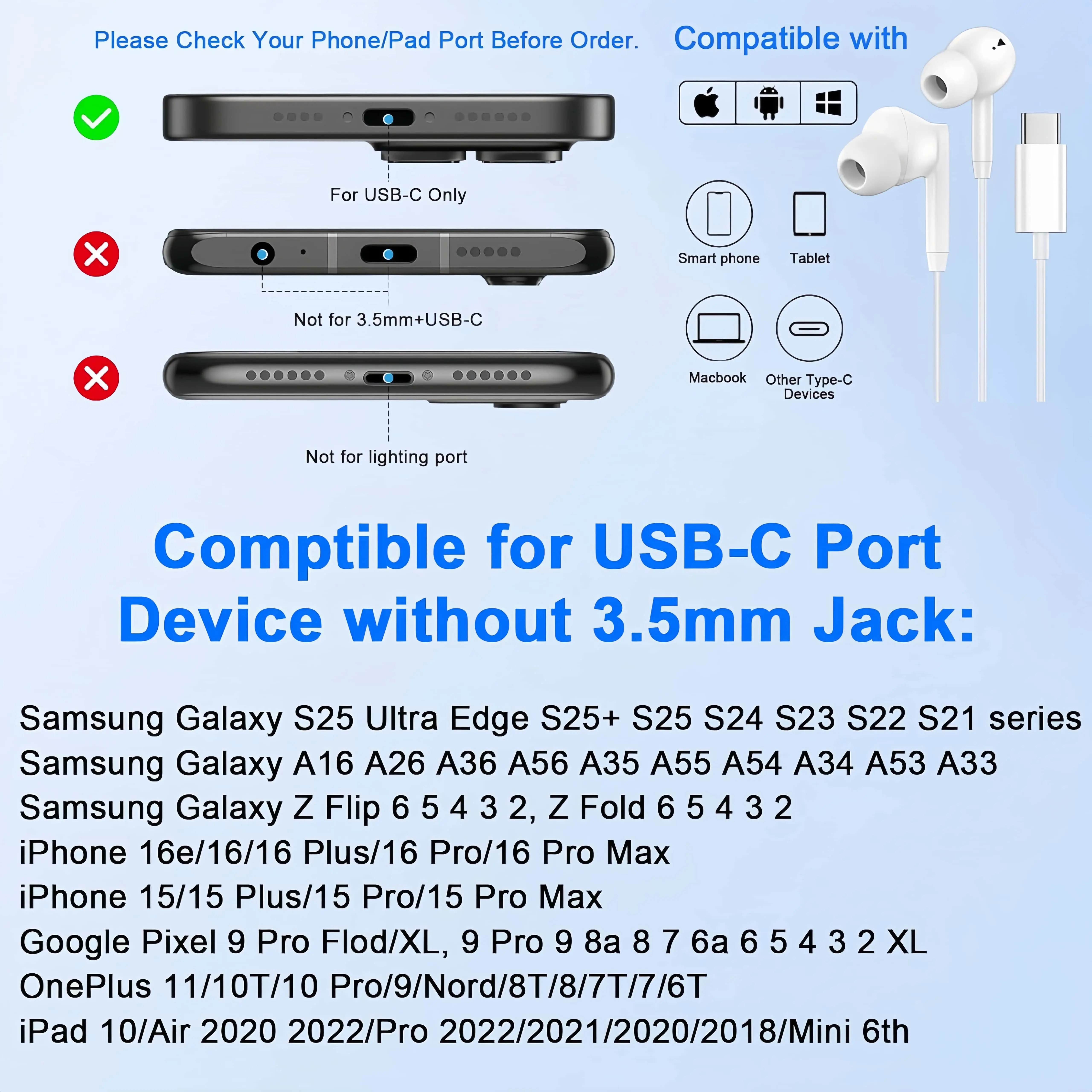 Perfect for Your Devices: These USB C Wired Earbuds are designed for iPhone 17, 16 Pro Max, 16e, 16 Plus, 16Pro, 15 Pro Max, 15 Plus, 15Pro, and Samsung. They offer a wired connection for seamless audio. Ideal for users seeking reliable earbuds with a Type C connector.