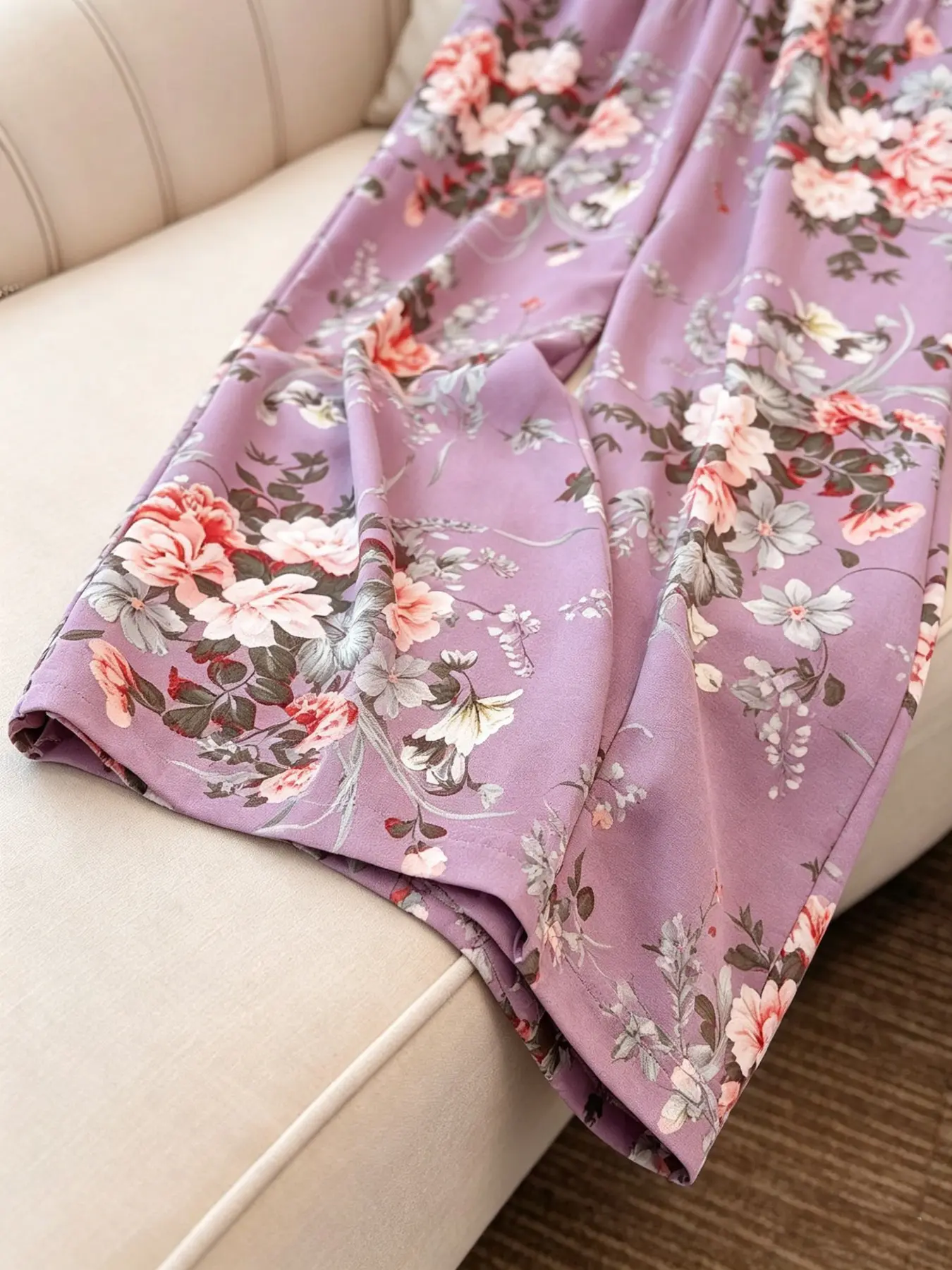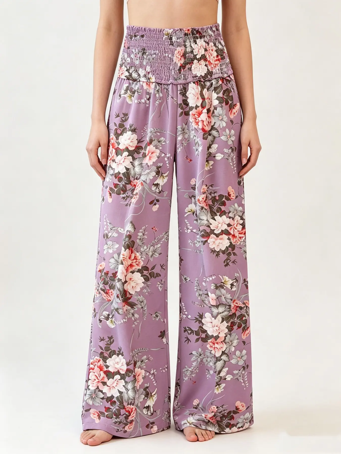 Lavender Floral High Waist Wide Leg Pants, Summer Casual Boho Palazzo Trousers with Pockets, All over Print, Fitted Style