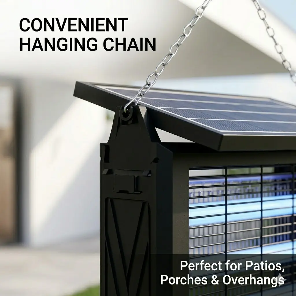 Elevate your outdoor space with this Solar Powered Bug Zapper. It features a 4500V high voltage electric system, effectively eliminating mosquitoes and other insects. Perfect for backyards, patios, gardens, and camping. This wireless, portable device comes with a light sensor for optimal performance. Keep your outdoor areas bug-free effortlessly.